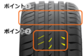 『スポーツマスター』は溝のパターン配置を最適化し、接地面積を最大化。高いグリップ性能とハンドリングの安定感を向上させている(写真のポイント①)。さらに特別な溝の造形が乾燥路面はもとより濡れた路面での排水性を高め、ウェットグリップ性能の向上に貢献する(同②)。サイズラインアップは185/55R16、215/50R17、225/45R18、235/50R18、225/40R19、245/40R20の6種類。