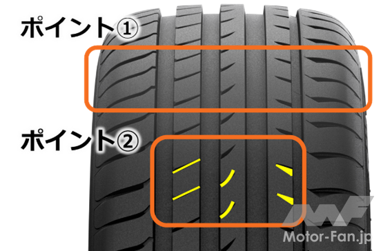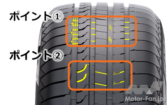 また、『スポーツマスターC/S』は特別な溝の造形と配置により、排水性を最適化。乾燥路面と濡れた路面の両方で高いグリップ性能を発揮させている(写真のポイント①)。そしてブロックパターンの剛性を高めることにより、ミニバンやSUVなど重心の高い車両でも高い走行安定性を実現(同②)。サイズラインアップは225/55R18、235/55R18、225/55R19、245/45R20の4種類となっている。