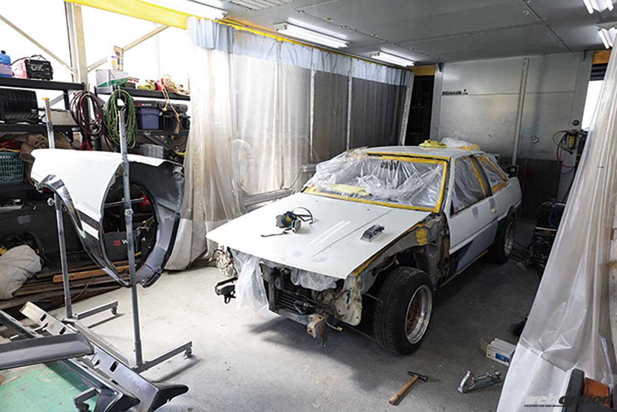こちらはボディのリフレッシュを進めているハチロク。フロアやリヤ回りの状態がかなり悪く、まんさく自動車レストア.comの鋼板パーツや、Workshop匠のドライカーボンパーツを導入し復活させるという。