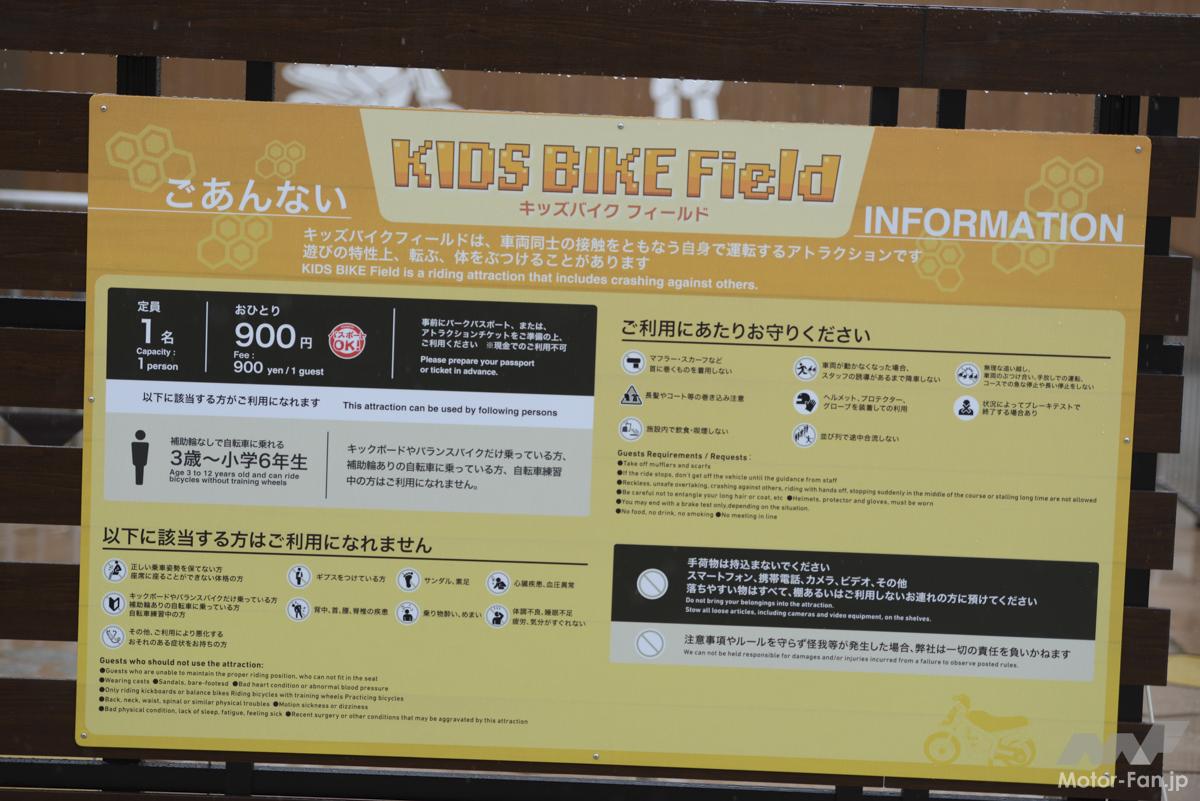 「KIDS BIKE Field」は、補助輪なしの自転車に乗れる3歳から小学生までを対象にした、バイクデビュー向けアトラクション。小学1年生の場合はここで体験し、ライセンスカードを取得することで、RINDO BIKEやモトレーサーへステップアップできる。子どもの成長に合わせて、二輪体験を段階的に広げていける仕組みになっている。保護者が見守れる専用エリアが用意されている点も安心材料だ。