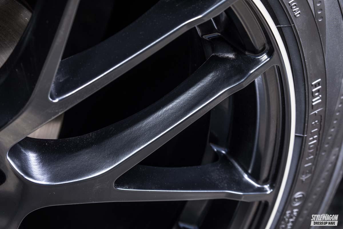 ベースとなるのは奥深い艶感が魅力なセミグロスブラック。引き締まった印象がこの黒で強まり、しかもほのかな艶感で色気も醸す。プレミアム感を高めるのは、リム外周をぐるりと走るダイヤモンドカットのライン。タイヤとの境界線がより明確になり、視覚的な大口径感が強まるのもポイント。そのライン上にさり気なく描かれるマシニングロゴも、優越を感じる要素だ