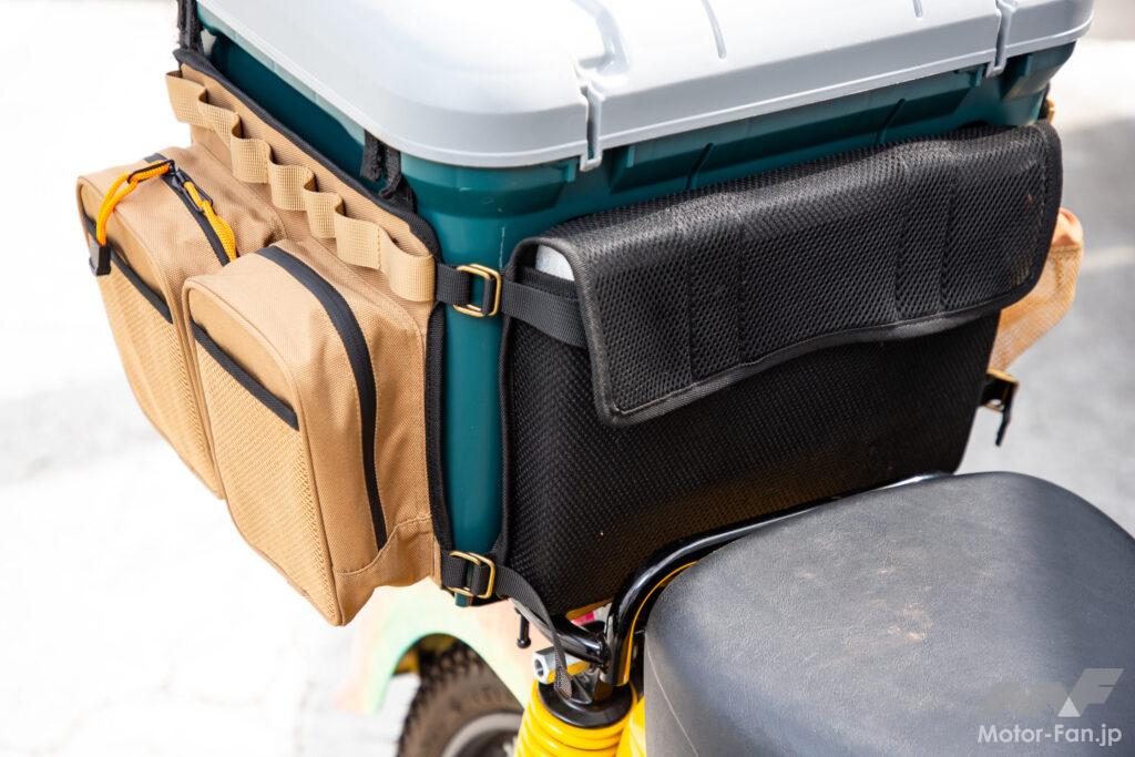 バイク用アパレルメーカーとして人気の「オリオンエース」の中で、「キャンプ&バイク」をキーワードにしているブランドがJAM’S GOLDだ。代表の長谷川氏がカブ乗りということもあって、サイズ感やテイストがカブに合うように開発された商品も多い。なかでもイチオシは、畳めばシートにもなる保冷機能付きバッグ。全周にモールが張り巡られ、ポーチなどが装着できる工夫もあって拡張性も高い。某芸人が扮するハンバーグ師匠が愛車のハンターカブで愛用している事でも有名。