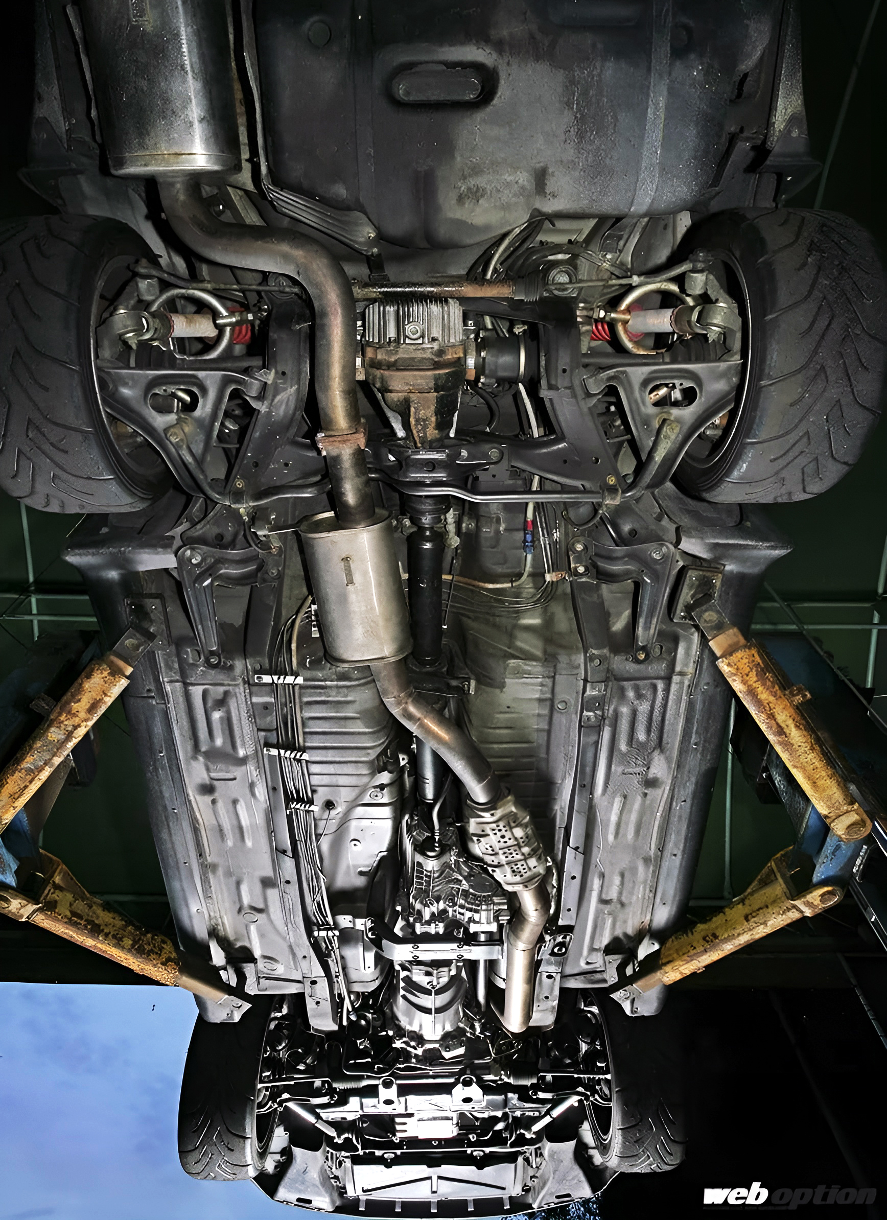 下回りを見れば、製作の苦労がうかがい知れるというものだ。RB26DETTと2JZ-GTEでは吸排気のレイアウトが逆になるため、エキゾーストマフラーはプロペラシャフトをまたぐようにワンオフ製作し、燃料ラインも反対側に引き直すなど、様々な箇所に2JZ化を成立させるための策が講じられている。
