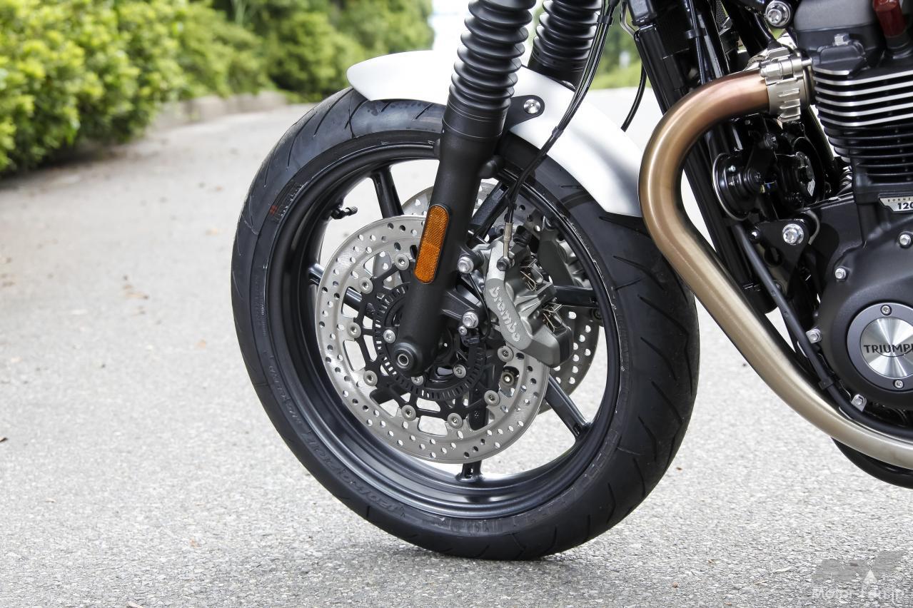 前後タイヤは17インチZRコードのピレリ製ディアブロロッソⅢ。ちなみにボンネビルT120はフロント18、リヤ17インチサイズ。フロントのジオメトリーも専用設計され、T120はキャスターが25.5°、トレールが105.2mm だったが、スピードツインは22.8°の93.5mm。フロントフォークを立てた設計が印象深い。