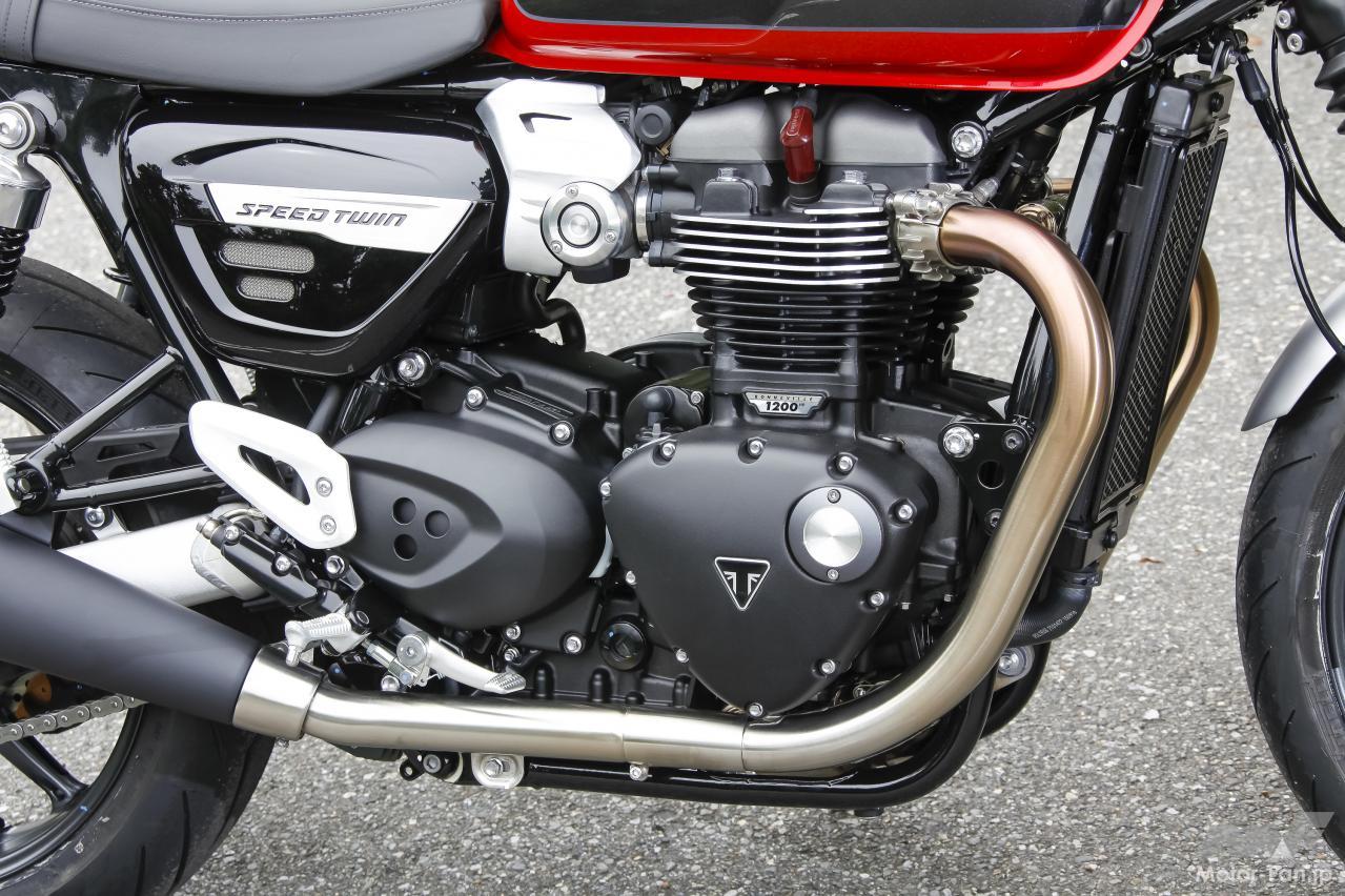 ボンネビルT120と比較すると圧縮比は10.0から11.0対1へと変更。最高出力は80ps/6,550rpmから97ps/6,750rpmへ、最大トルクは105Nm/3,100rpmから112Nm/4,950rpmへ大幅に向上している。