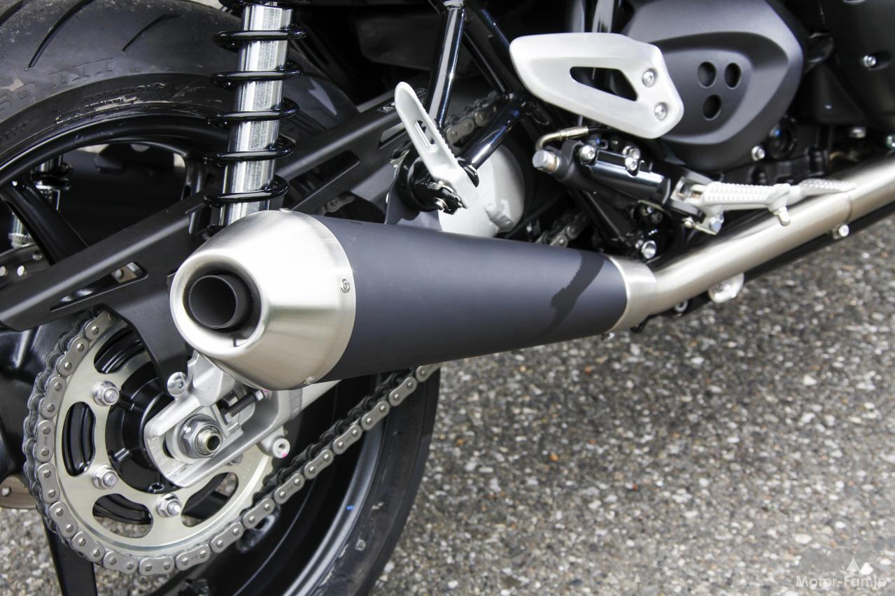 まず全体の雰囲気はボンネビルから派生したモデルらしく、バーチカルツインエンジンを搭載する王道的なデザインセンスが親しみやすく筆者にも好感触。それでいて各部に、さりげなく吟味された使用パーツが目に入り、艶消しアルミ製ショートフェンダーの採用や軽快な7本スポークデザインのアルミキャストホイール等、全体にガッシリと逞しさの中に、スッキリとシェイプされたスタイリングが印象的である。