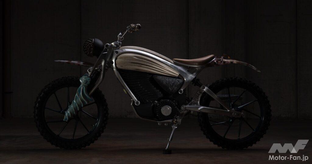 マグネシウム製バッテリーケースは、有機的なデザインの試みとして、過去と未来をつなぐシームレスな融合を象徴するフィンと、鍛造アルミフレームの特性を活かした黒い石のパーツが特徴である。さらに、手作りの革製タイヤに描かれたツバメのモチーフが、故郷への帰還、忠誠心、冒険心を表現している。