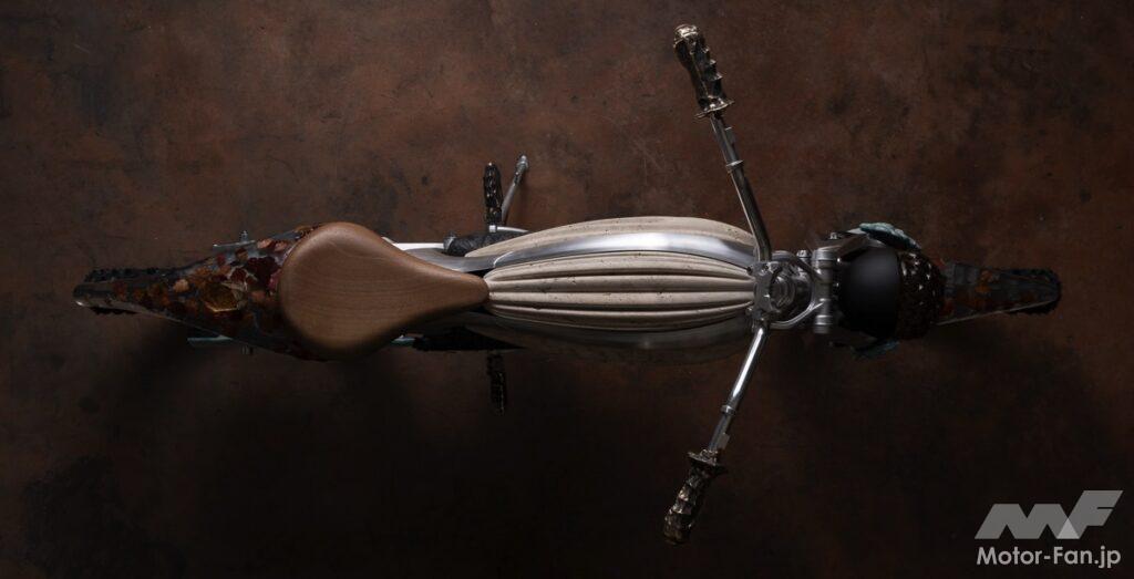 「MOTOTOTEM」は、FLYING FLEAのFF.C6モデルをベースに、トラバーチン、粘土、ブロンズ、石、レザー、吹きガラスなど多様な自然素材を取り入れて再構築された。特に、鍛造アルミニウムフレームやガーダーフォーク、マグネシウム製バッテリーケースなどのパーツが再設計され、独創的なデザインが施されている。