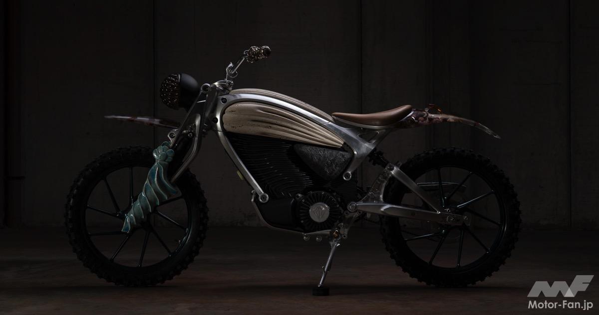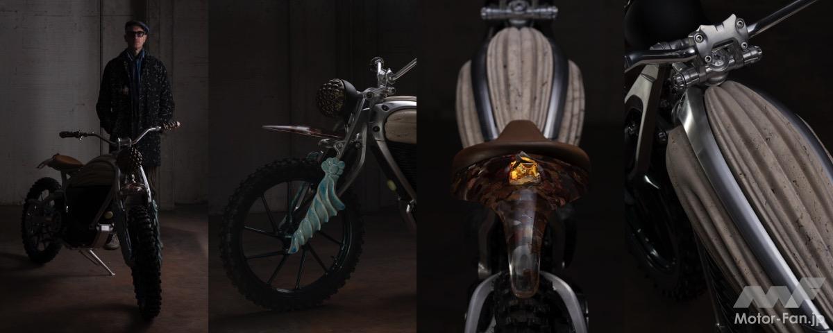 「MOTOTOTEM」は、FLYING FLEAのFF.C6モデルをベースに、トラバーチン、粘土、ブロンズ、石、レザー、吹きガラスなど多様な自然素材を取り入れて再構築された。特に、鍛造アルミニウムフレームやガーダーフォーク、マグネシウム製バッテリーケースなどのパーツが再設計され、独創的なデザインが施されている。