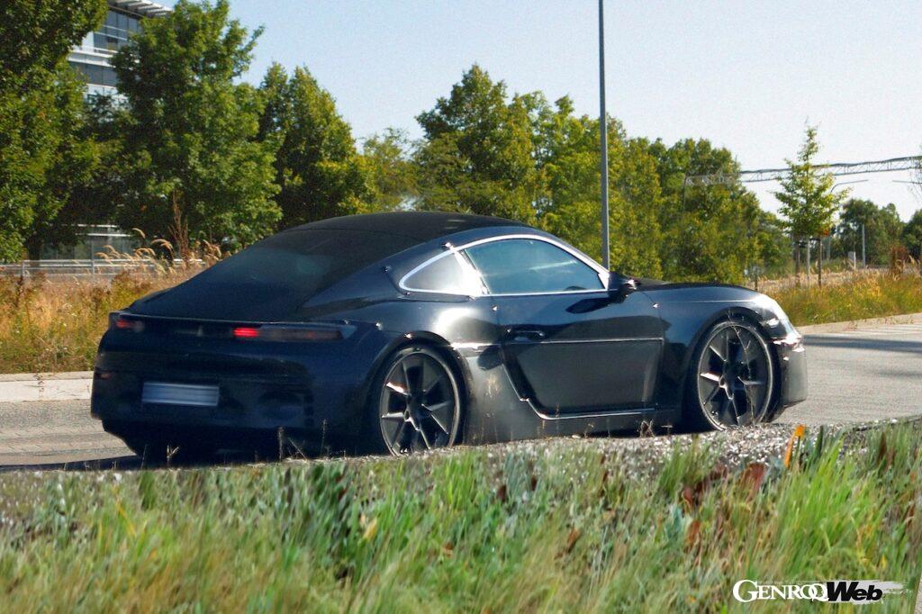 側面では、リヤフェンダー前部にスリムな吸気口を配置しているのが確認できる。リヤクォーターウインドウの形状は巧みに隠されており、量産型のデザインは不明だ。リフトバックパネル全体はガラス製で、ハッチはルーフからアクティブスポイラーの先端まで伸びているように見える。恐らく垂直のブレーキライトがハッチ上部に配置され、LEDテールライトの間には「PORSHCE」のロゴが入るだろう。