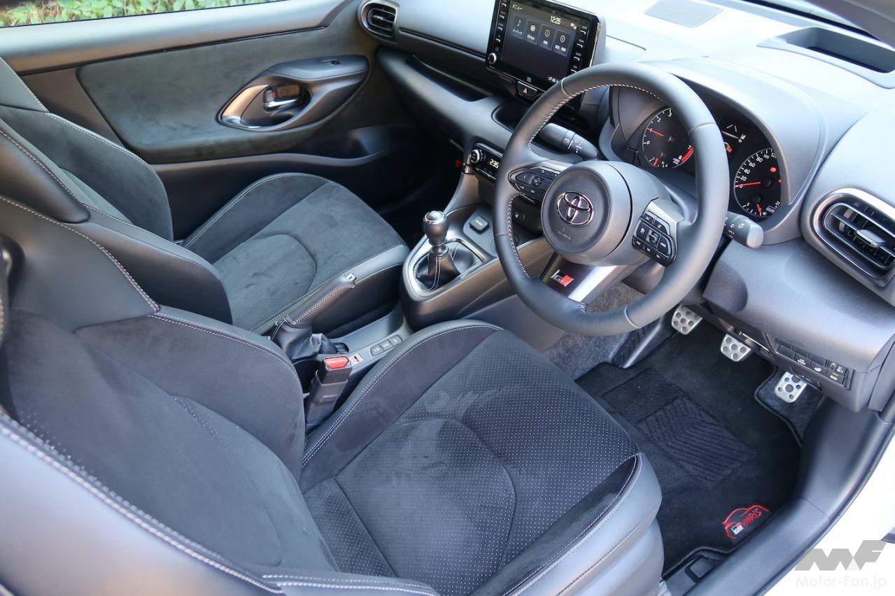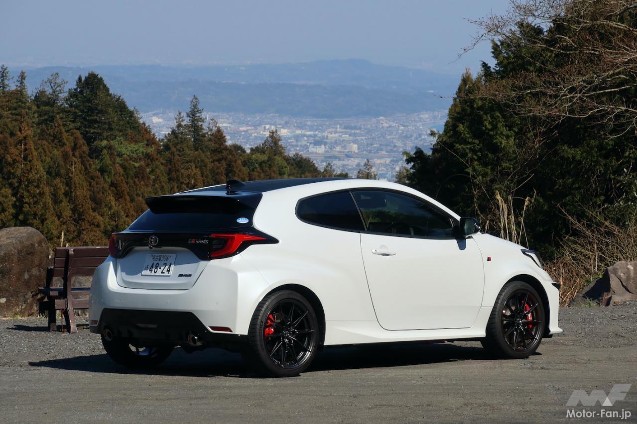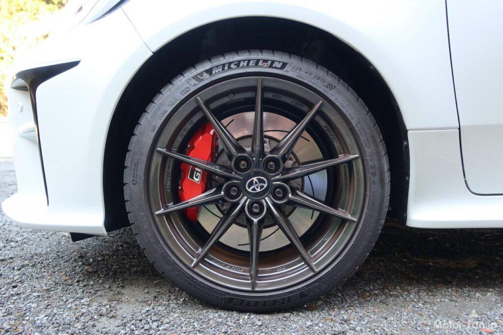 GRヤリス RZ"High Performance" 全長×全幅×全高:3995mm×1805mm×1455mm ホイールベース:2560mm 車重:1280kg サスペンション:Fストラット式/Rダブルウィッシュボーン式 エンジン形式:直列3気筒DOHCターボ エンジン型式:G16E-GTS 排気量:1618cc ボア×ストローク:87.5mm×89.7mm 圧縮比:10.5 最高出力:272ps(200kW)/6500rpm 最大トルク:370Nm/3000-4600rpm 過給機:ターボチャージャー 燃料供給:DI 使用燃料:プレミアム 燃料タンク容量:50ℓ トランスミッション:6速MT(iMT) 駆動方式:AWD WLTCモード燃費:13.6km/ℓ 市街地モード10.6km/ℓ 郊外モード13.8km/ℓ 高速道路モード15.3km/ℓ 車両価格○456万円 オプション 予防安全パッケージ24万9700円などop込みの価格は494万2250円