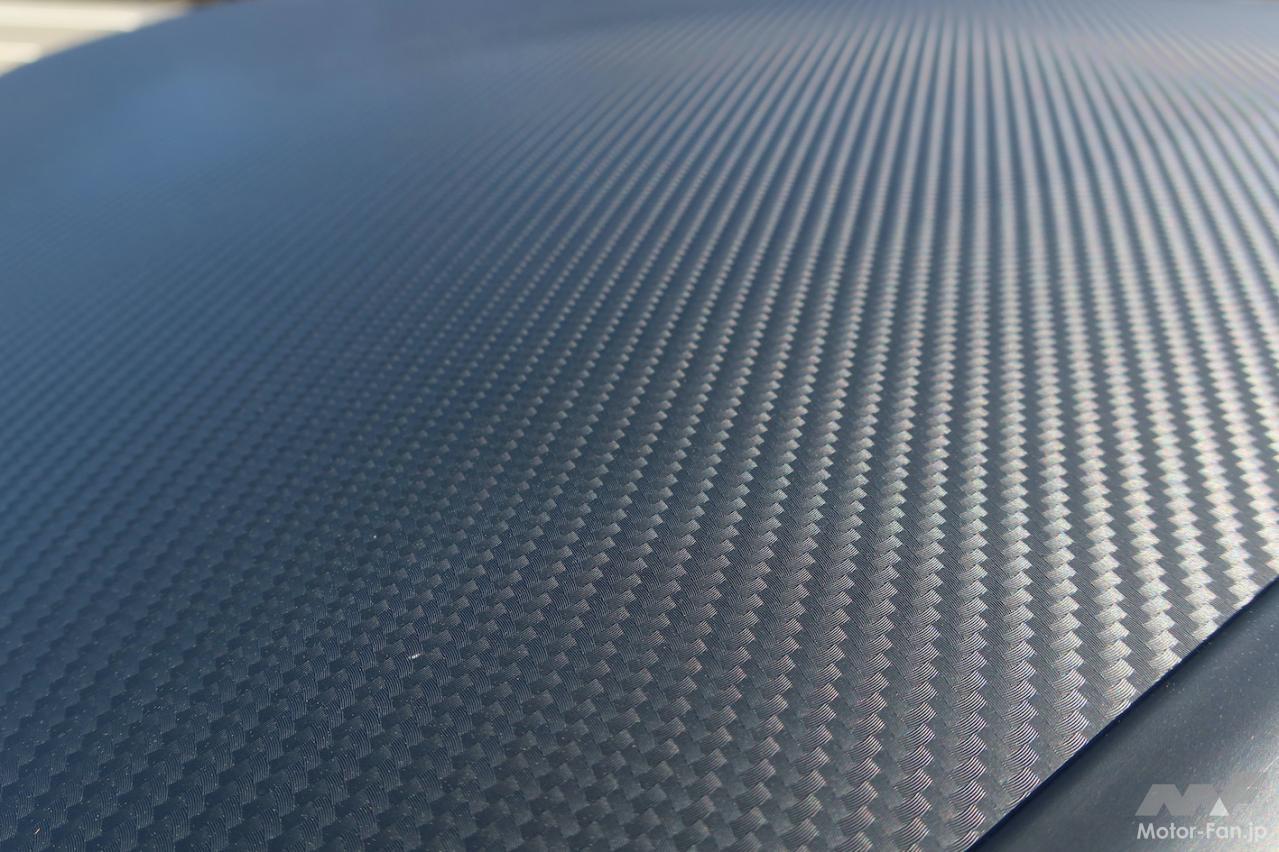 その下に隠れているカーボンは、カットした炭素繊維(チョップドカーボン)を樹脂中に分散させたシート状の材料をプレス成形するC-SMC法で作ったものだ。そのため、織物のように規則正しい幾何学的な模様とはなっていない。見栄えの観点から、高級そうに見える織物模様のシールを貼ることにしたのだろうか(そのぶん重くなるが)。