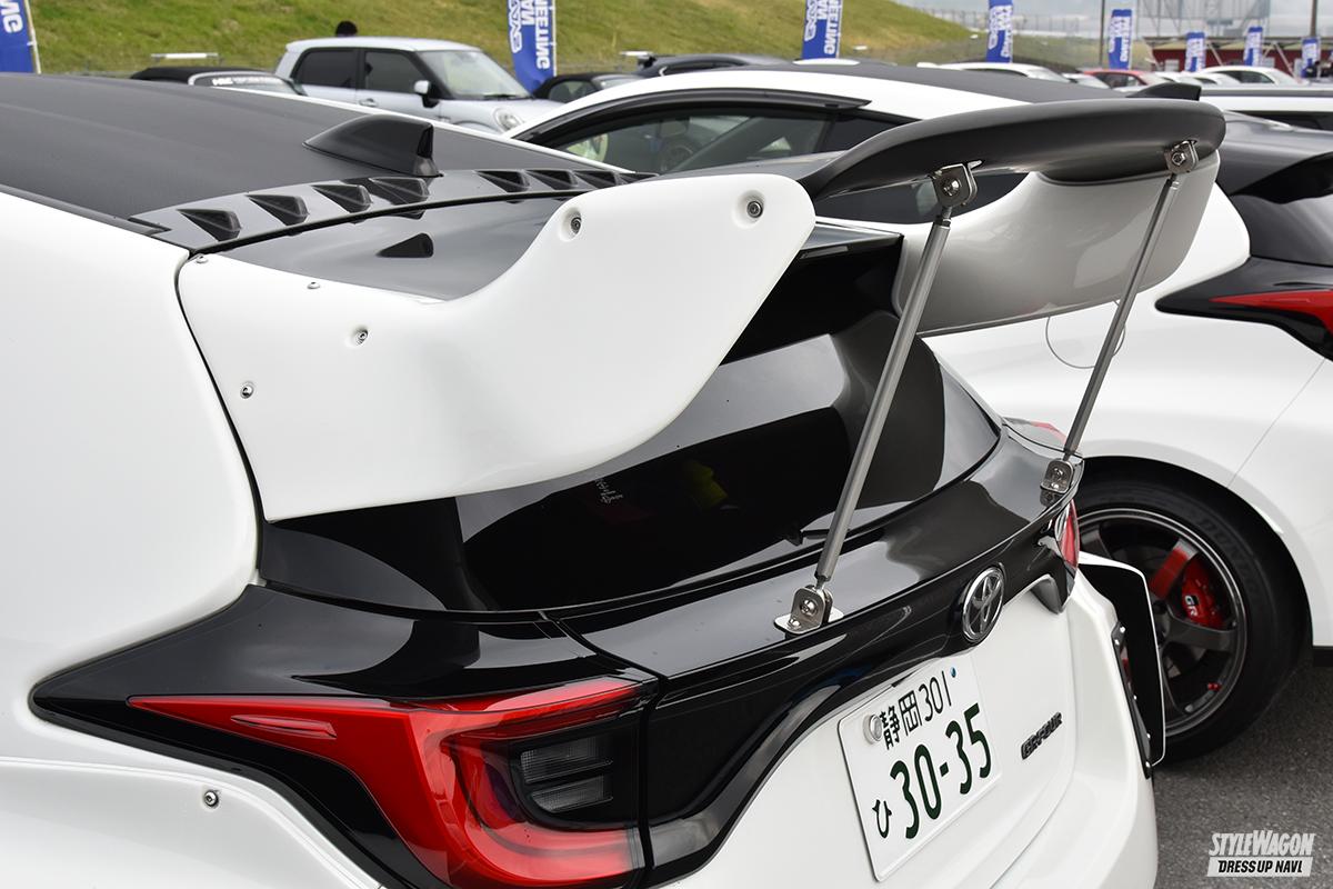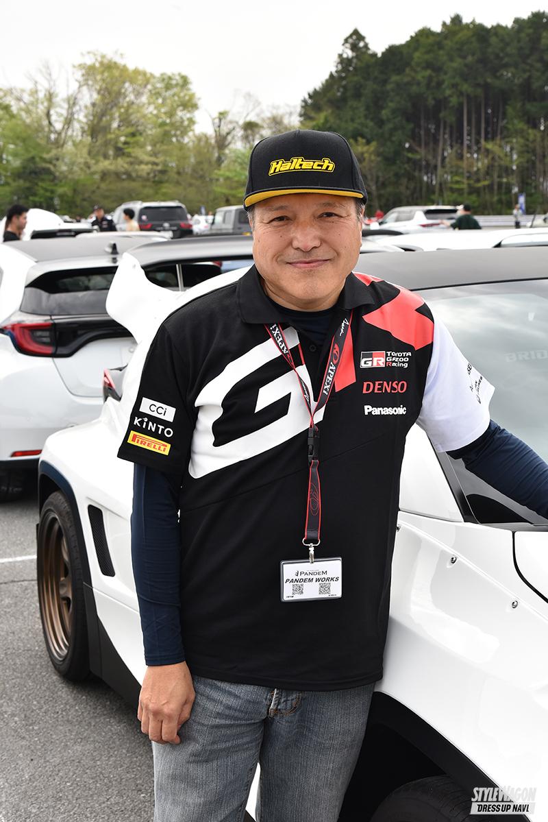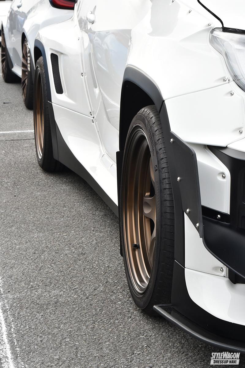 TRA京都のパンデムワイドボディキットを装着し、唯一無二のスタイルに仕上げられるGRヤリス。これまでの3年間で構造変更や改造申請など5回の車検を受けるなど、このスタイルで全てが公認仕様。しかも、塗装以外は全てDIYで仕上げているという1台だ。アルトワークスRなどサーキット用に6台ほど持っていたのだが、パンデムのGRヤリスのイラストを見て一目惚れ。そこから車検を通すために何度も車検場に通ったという。1機目のエンジンはブローして炎上。現在、3機目に載せ換えるべく、DIYでバラして磨き上げているという。また、ミッションを7速シーケンシャルに変更予定。「チェコのメーカーなんだけど、強度検討書を頼んでいるんです。こればっかりは自分じゃ無理なので、でもそれ以外は自分で全部やってます」。