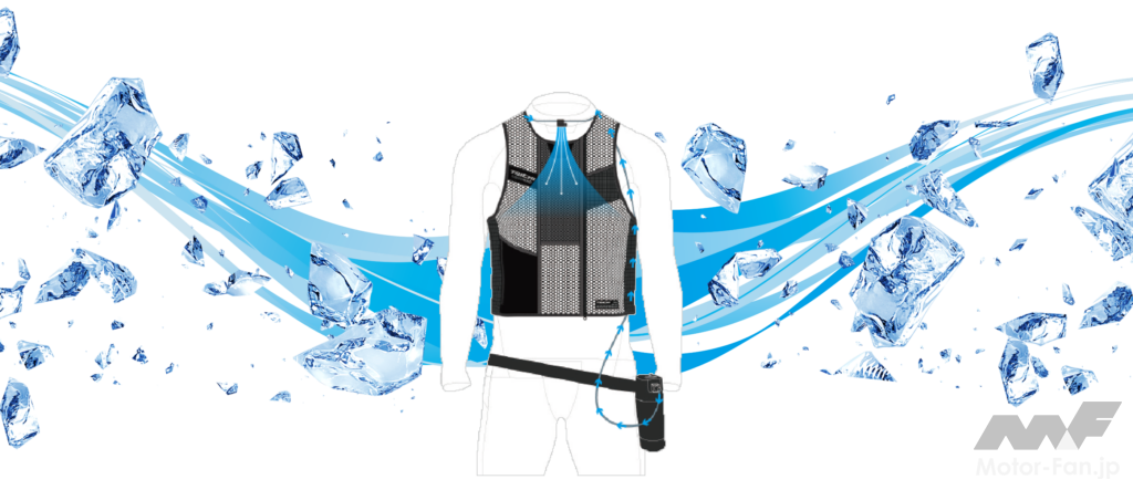 アールエスタイチは、走行風を利用して身体を冷却する気化冷却システム「LIQUIDWIND」の新型専用ベスト「RSU505 リキッドウインド ブースター ライトベスト」を2026年4月より発売する。猛暑対策が重要となるライディングシーンに向け、冷却効率と装着感を高めた最新モデルとして投入される。LIQUIDWINDは、腰に装着した電動ボトルから専用冷却水をアンダーウエアへ送水し、走行風による気化冷却で胸部と背中を冷やすシステム。新型ベストRSU505は給水経路を見直し、送水チューブ径を細くすることで容積を約60%削減。チューブ内に残る液量を減らし、冷却水を首元へ素早く届けることで冷却の立ち上がりを向上させた。ベスト本体はメッシュ素材とストレッチパネルを組み合わせた軽量設計を採用。身体に自然にフィットし、長時間のツーリングでも疲れにくい着用感を実現する。価格は税込1万450円。また、専用冷却水「RSP516 ギャツビー リキッドウインド ウォーター」の大容量タイプも同時に展開。従来モデルの約4倍の容量となり、頻繁に使用するユーザーのランニングコスト軽減にも配慮した。リキッドウインドはファン付きウエアと組み合わせることで走行風がない状況でも冷却効果を発揮する。ツーリングだけでなく、キャンプや釣り、屋外作業など幅広いシーンでの猛暑対策としても活用できる冷却システムとして注目されている。