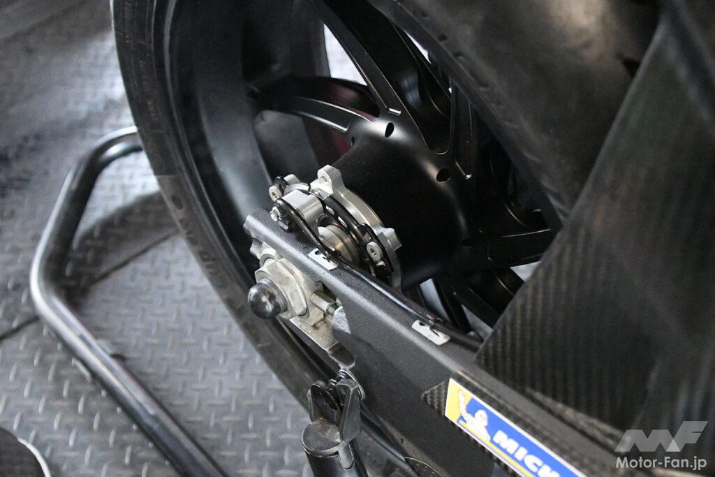 大きなバッテリーパックをフレームの一部とし、リアブレーキはブレーキディスクを備えず、電気ブレーキが採用されている。この電気ブレーキはドゥカティのオリジナルだ。リアブレーキをかけると回生エネルギーが発生する。また、バッテリーは、これもドゥカティ独自の冷却システムによって温度管理がなされている。