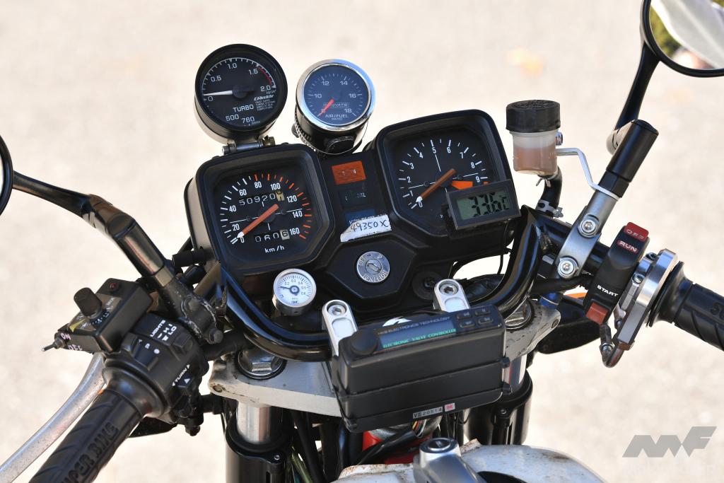 最大の注目要素は気化器のインジェクション化とターボチャージャーの導入だが(過給圧が1.5barでの最高出力は45ps‼)、小径&幅広化が図られた前後タイヤ(120/70ZR17・140/70ZR17。ノーマルは3.00S-18・4.00S-18で、ミリ表記だと90/90-18・110/90-18相当)もノーマルとの大きな相違点。