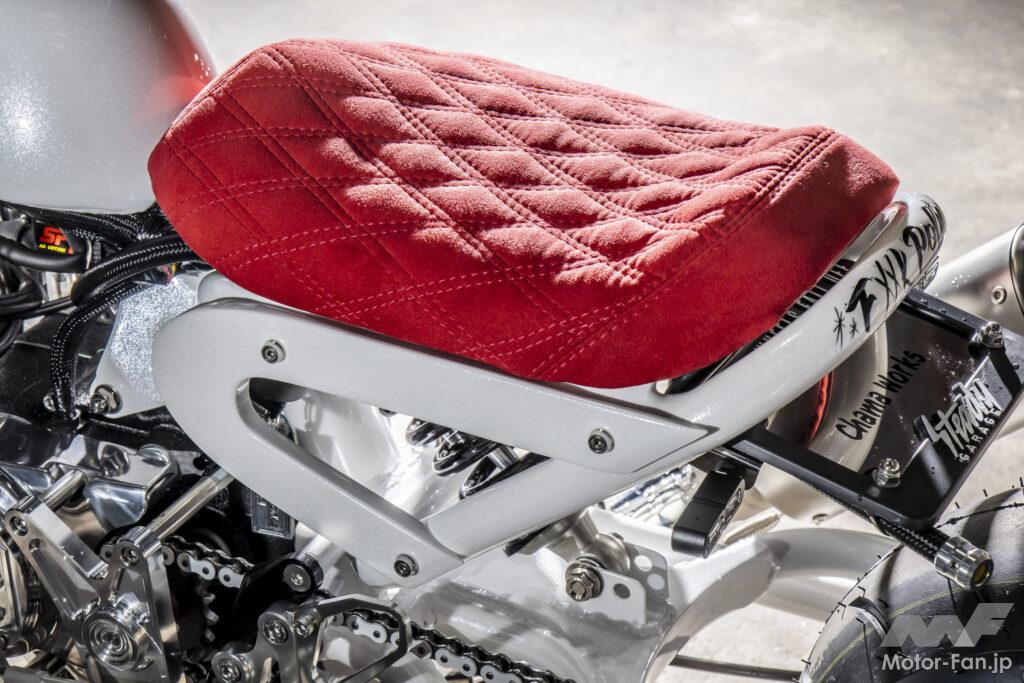 ズーマーっぽさを表現するため、サイドカバーにあたる部分はFRPで製作。シートは表皮にアルカンターラを使ったお手製だ。