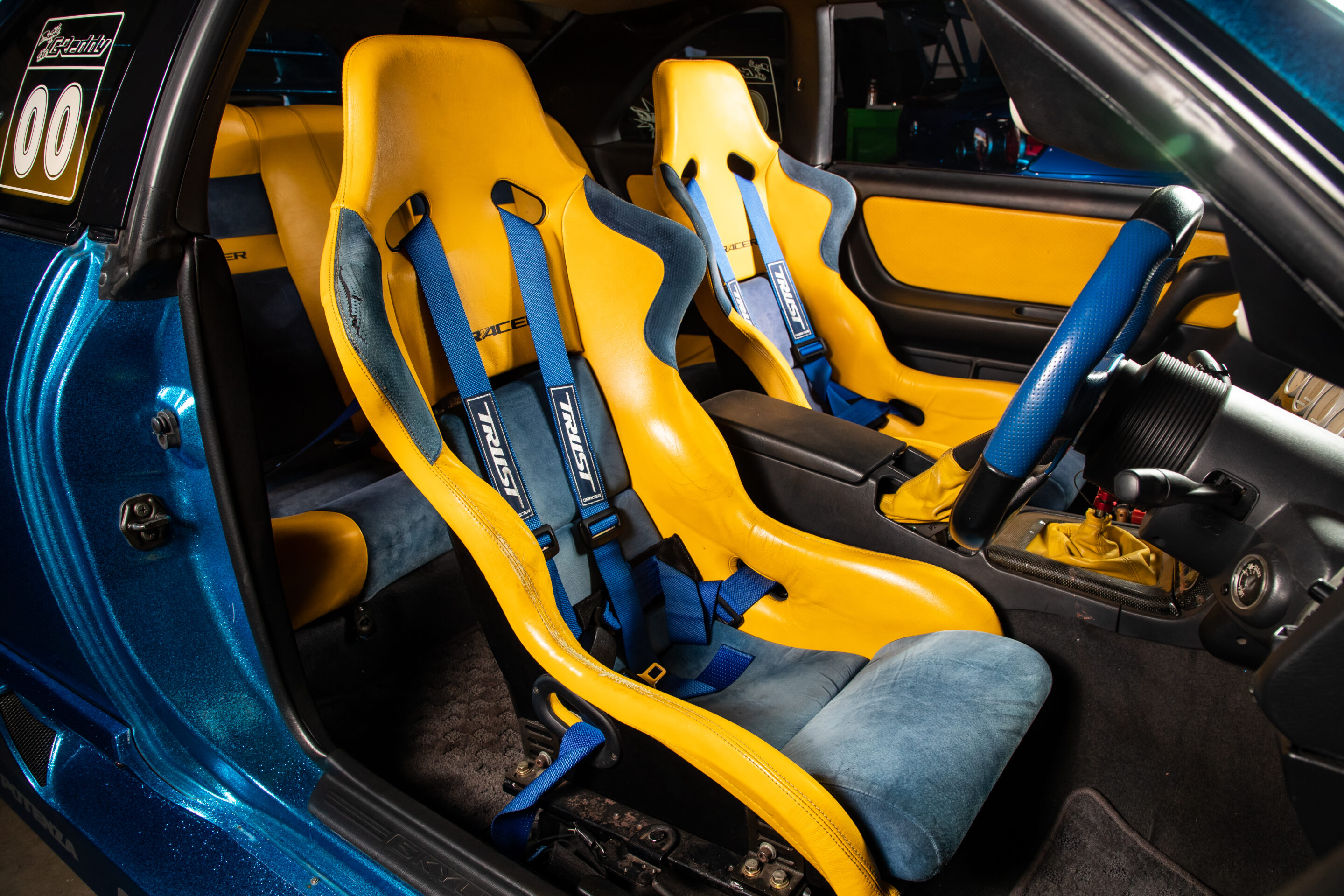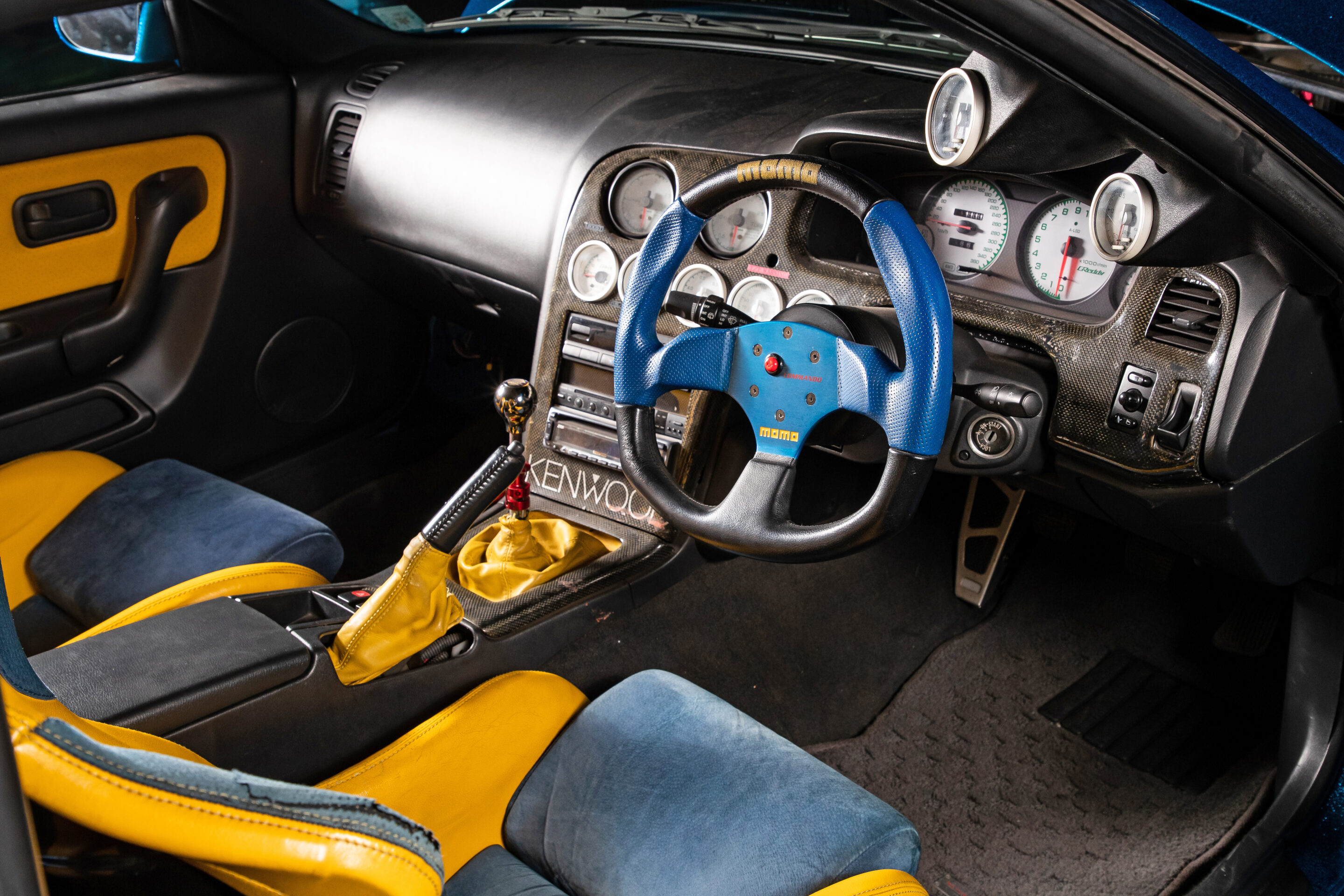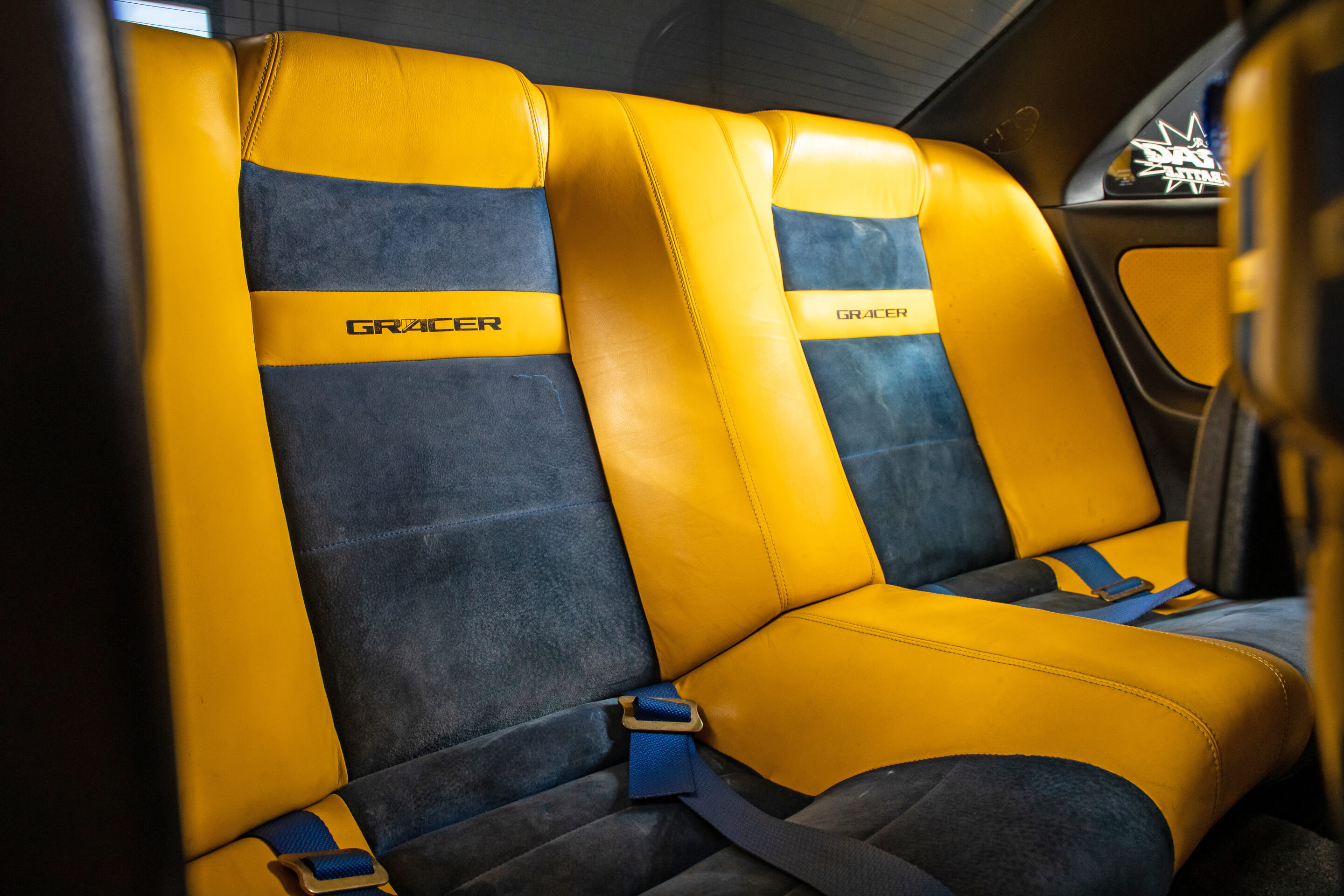 ブルーとイエローのトリムが使用されたフルバケットシートとリヤシートは当時のまま。ステアリングは交換されているが、しっかりとカラーコーディネイトされているところに、歴代オーナーの拘りが見て取れる。