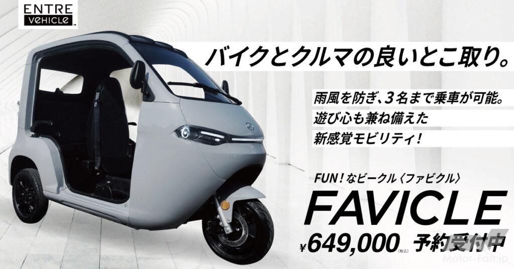 株式会社アントレックス(東京都新宿区)は、電動トゥクトゥク「FAVICLE(ファビクル)」の予約受付を開始した。FAVICLEは、リチウムイオンバッテリーモデル(85万円・税込)とLeadバッテリーモデル(64万9,000円・税込)の2種類を展開。オプションの専用レインカバーは3万3,000円(税込)で提供される。7月入荷予定で、現在予約受付中。試乗車も用意される予定で、実際の乗り心地を体感できる機会が設けられる。