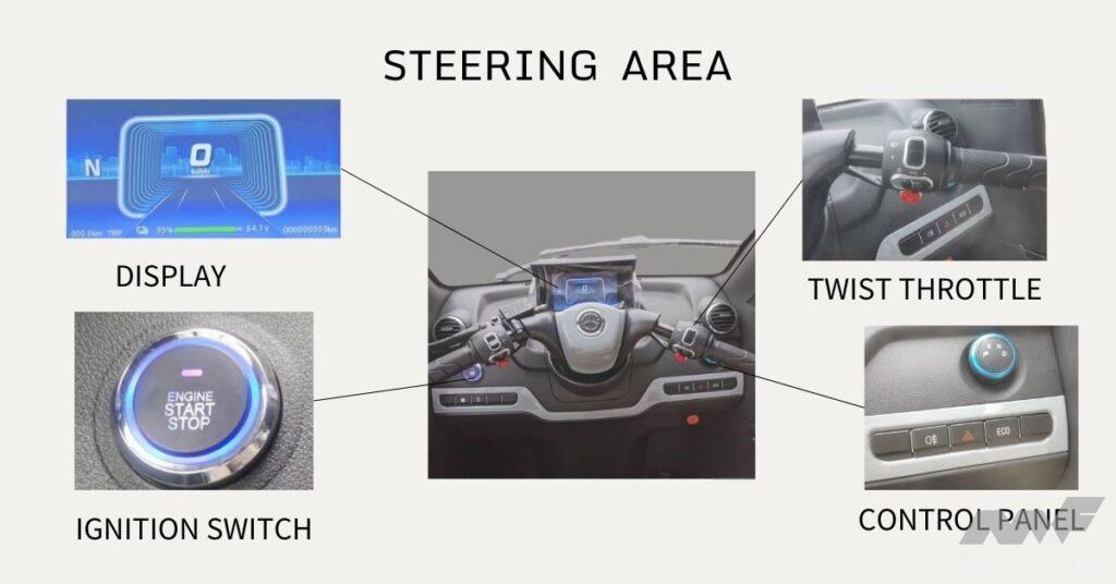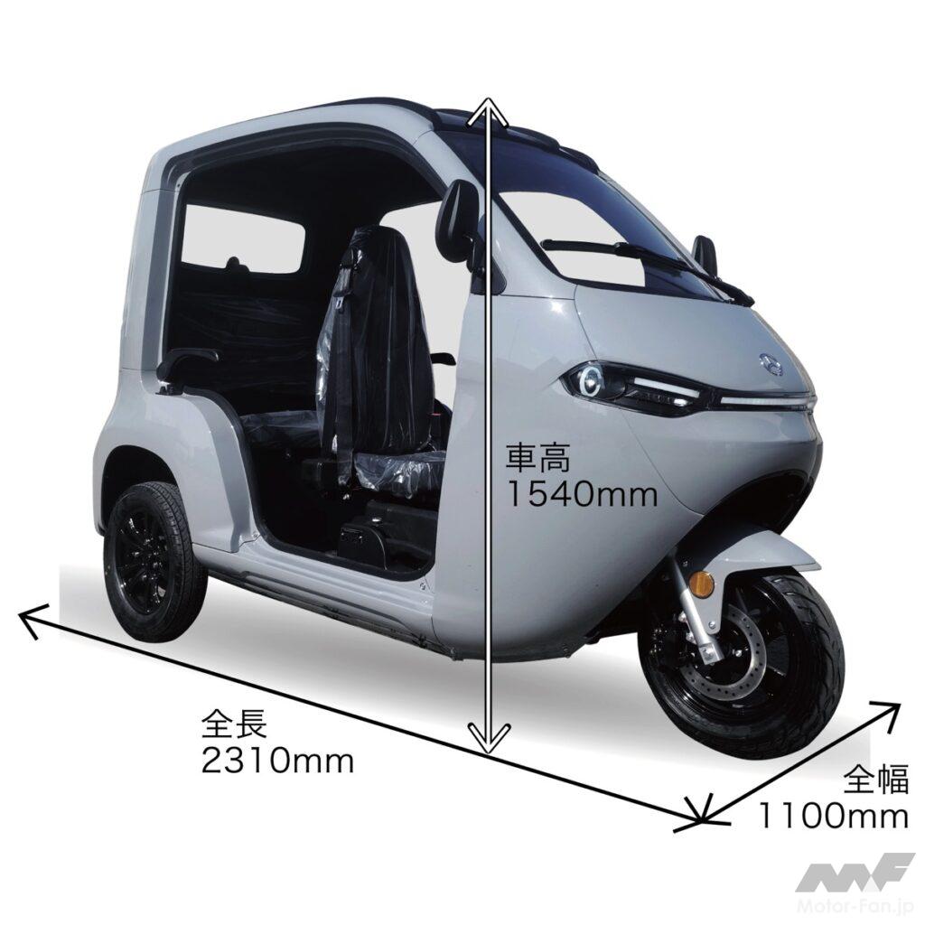全長231cm、幅110cm、高さ154cmのコンパクトなボディは、細い路地や狭い駐車場でも楽に走行・駐車が可能。3輪設計により安定感があり、ハンドブレーキとフットブレーキの両方を備えているため、初心者や女性、高齢者でも安心して運転できる。ドアのない開放的なデザインとフロントスクリーンにより、視界も良好だ。