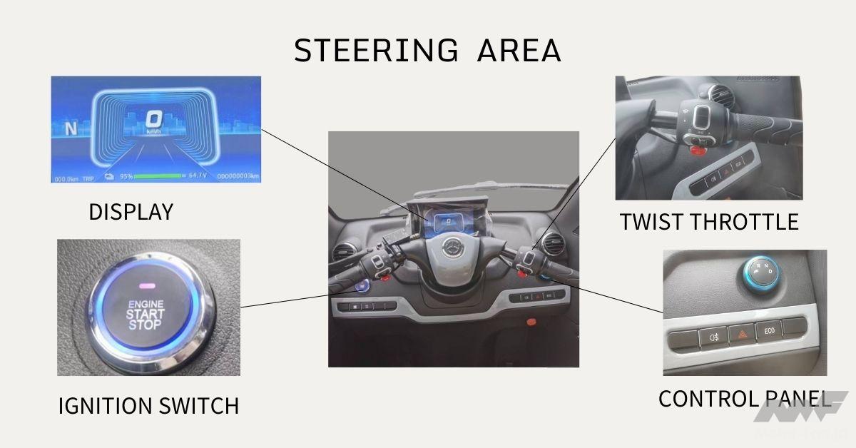 全長231cm、幅110cm、高さ154cmのコンパクトなボディは、細い路地や狭い駐車場でも楽に走行・駐車が可能。3輪設計により安定感があり、ハンドブレーキとフットブレーキの両方を備えているため、初心者や女性、高齢者でも安心して運転できる。ドアのない開放的なデザインとフロントスクリーンにより、視界も良好だ。