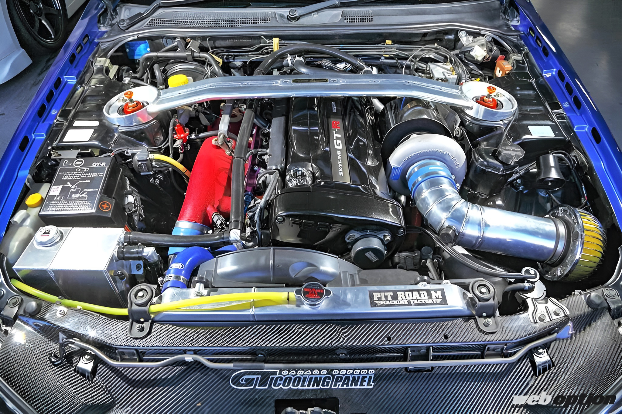 エンジンはブースト圧1.3キロ時に最高出力800ps、最大トルク80kgmを発生させる仕様。排気量は2.6Lのままだが、腰下ムービングパーツの強化およびバランス取りは徹底して行われており、インマニの赤い結晶塗装やエンジンカバーをブラックアウトするなど見た目にも拘る。乗り味はドッカンだが、全体的に丁寧な仕上がりだ。
