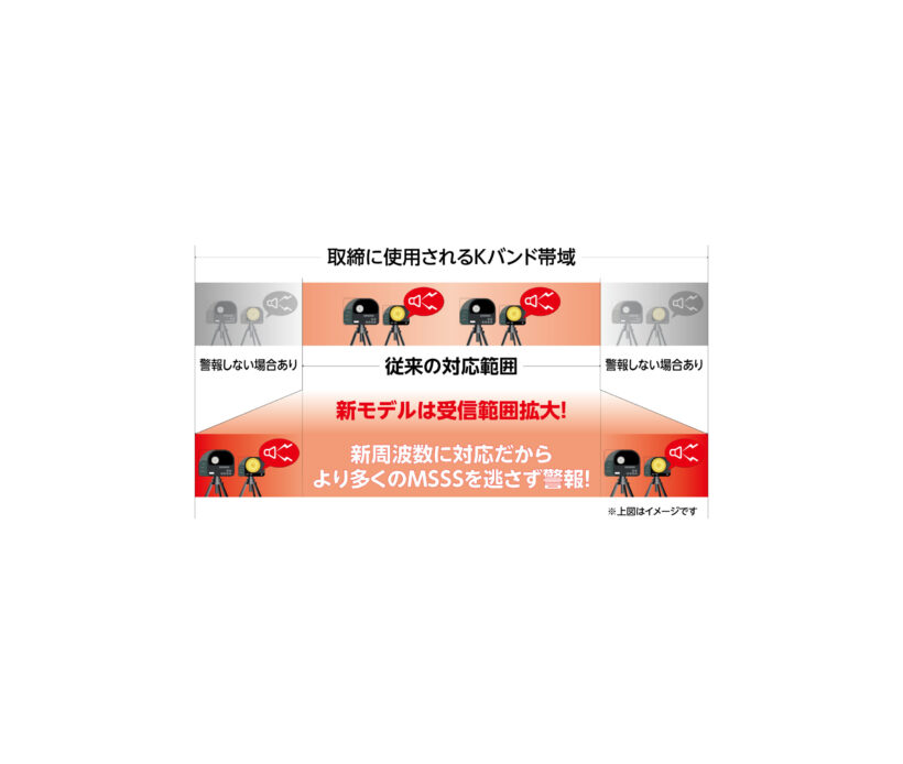 そのひとつが JMA系やMSSS系といった、現在主流になる取り締まり機への対応。国内で確認できている取り締まり機を全て網羅しているのだ。この対応力は現行モデルだけでなく、従来モデルからキャリーオーバーされているが、さらに第6世代になるとXバンド帯の誤警報を大幅に低減させるスキャン機能を搭載。従来機と比べると最大で87%も誤警報を抑えてくれるため、警報の精度が格段にアップしているのだ。