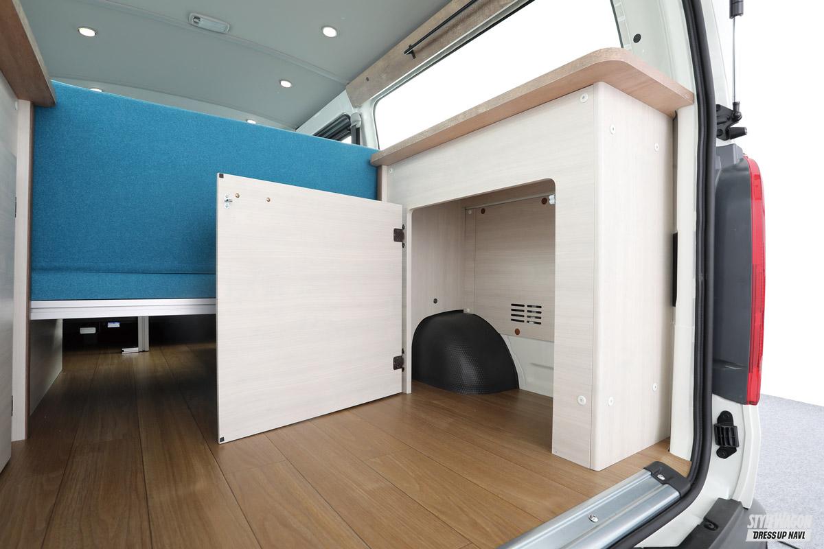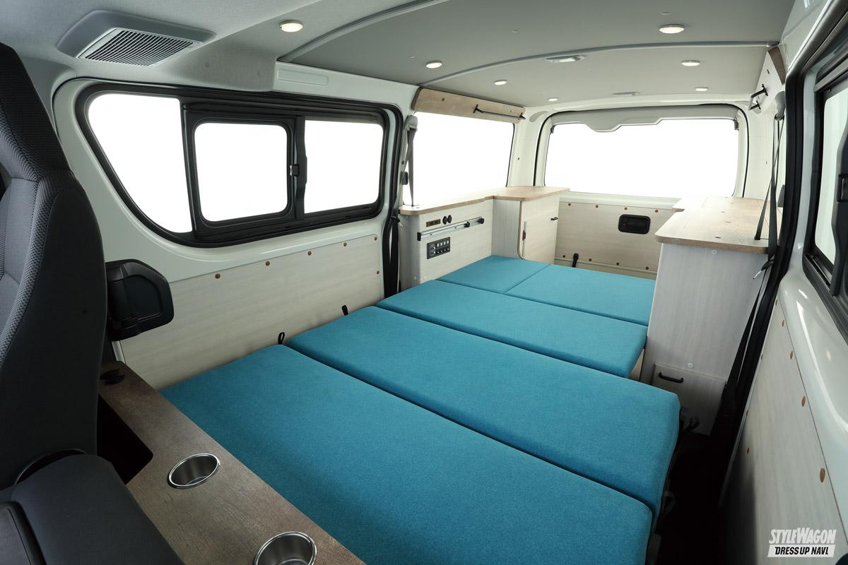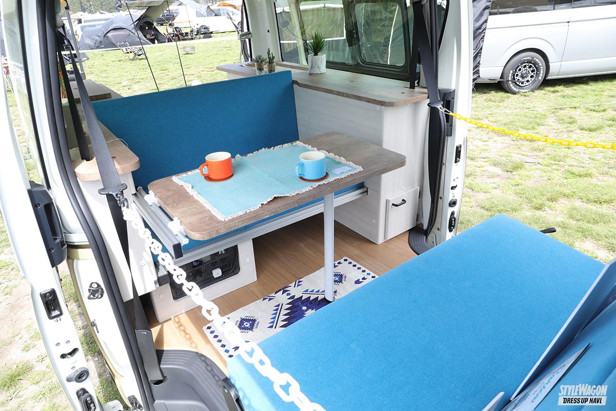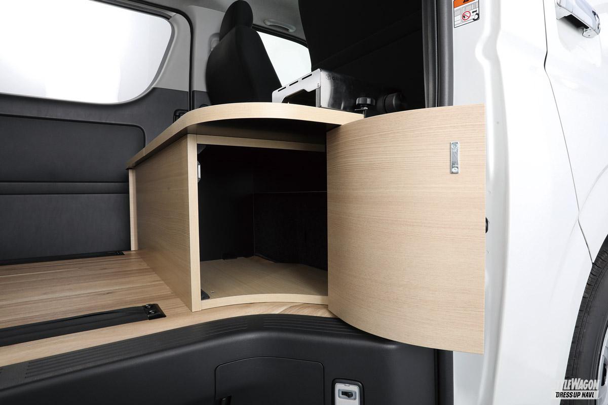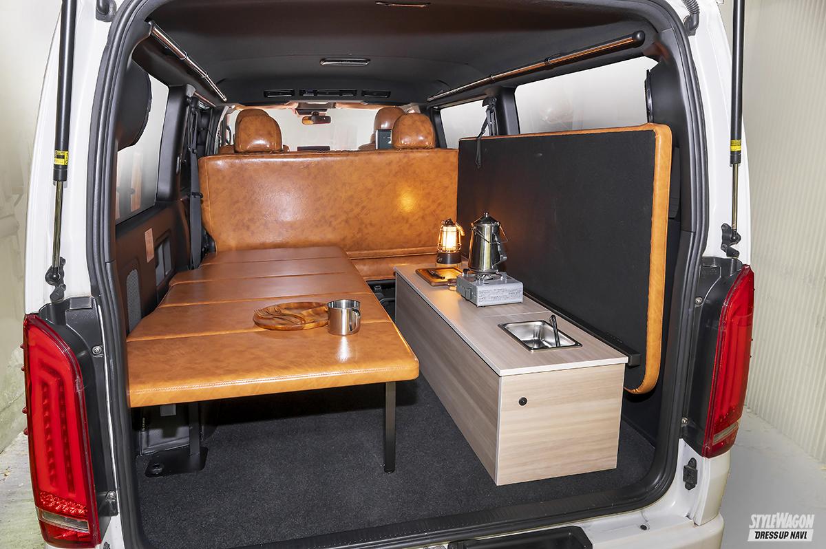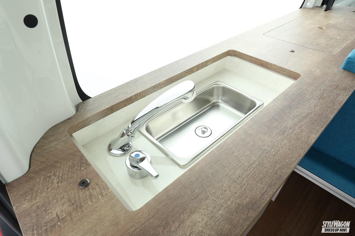 シンクとコンロ、収納を兼ねたキッチン家具が装備されるのも便利で、キッチン使用時以外には平台としても活用可。キャンプに必要な設備は最低限、装備されている。