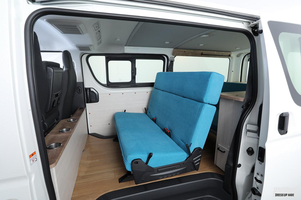 6人乗りの8ナンバー登録となるリトリートパッケージは、キャンピングカー的な使い方も楽しめるアクティブカーライフに最適な仕様。ベッド兼用マルチシートやキャンピングカー専用セカンドシートなどが装備され、ラゲッジでは左右両側にキャビネットも搭載するなど実用的。ベッドはフルフラットにもなるため、別荘的な感覚でくつろげて自由に移動できるのが魅力だ。