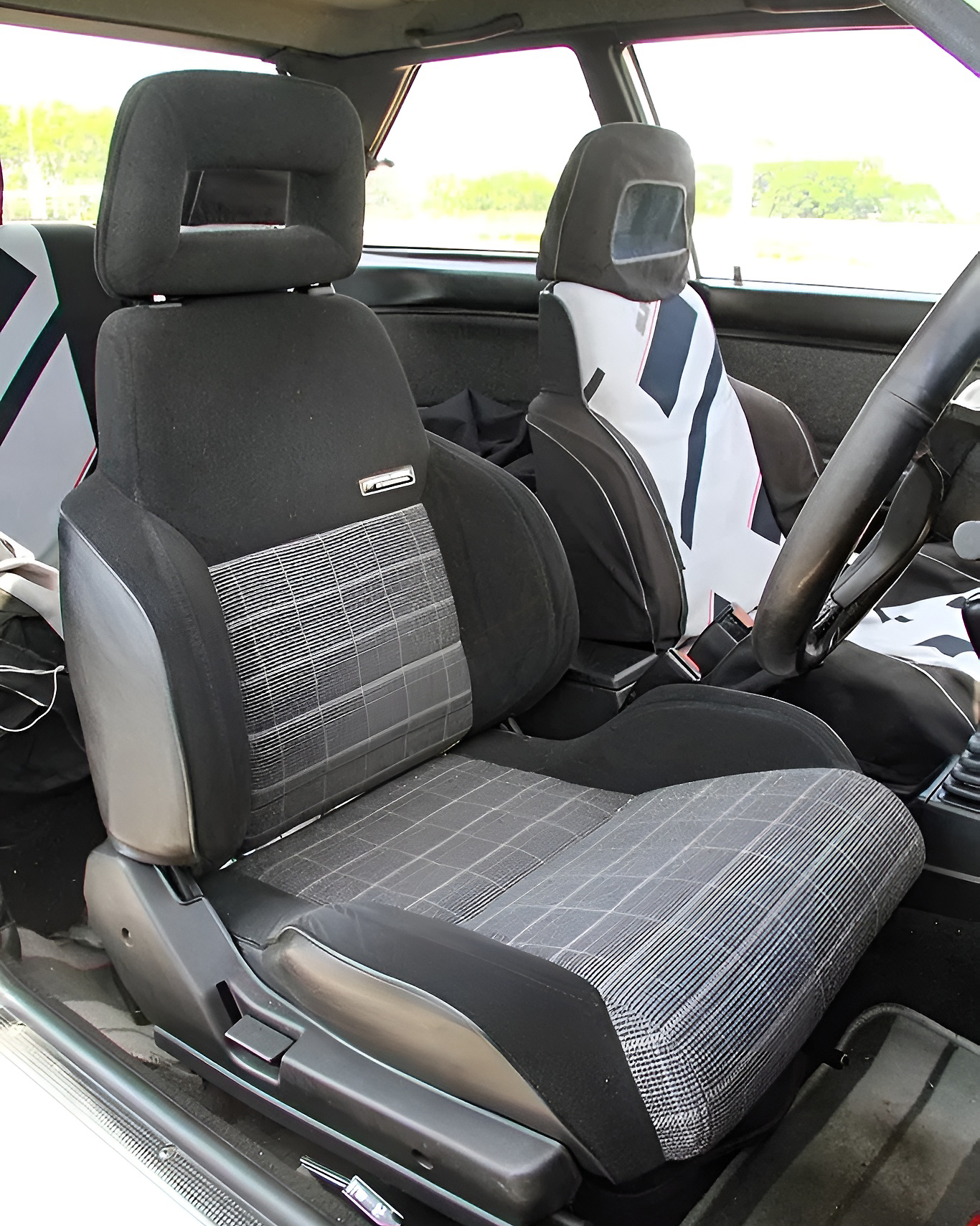 前席はサイドサポートが大きく張り出した専用品を装着。助手席&後席のシートカバーは希少な純正オプション品だ。