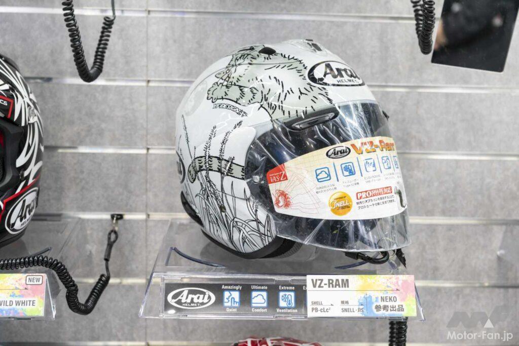 ジェットタイプのVZ-RAMに展示されていた猫グラフィックも見逃せない存在だ。このデザインはYFデザインによるもので、昨年フルフェイスのASTRO GXで発表され好評を博したもの。繊細なタッチで描かれた和風テイストの猫は、バイク乗りだけでなく“猫好き”の心にも刺さる独特の魅力を持っていた。その人気グラフィックが、今回はジェットタイプの人気モデルVZ-RAMにも展開されたかたちとなる。参考出品ではあるが、すでに実績のあるデザインだけに、市販化への期待は高い。