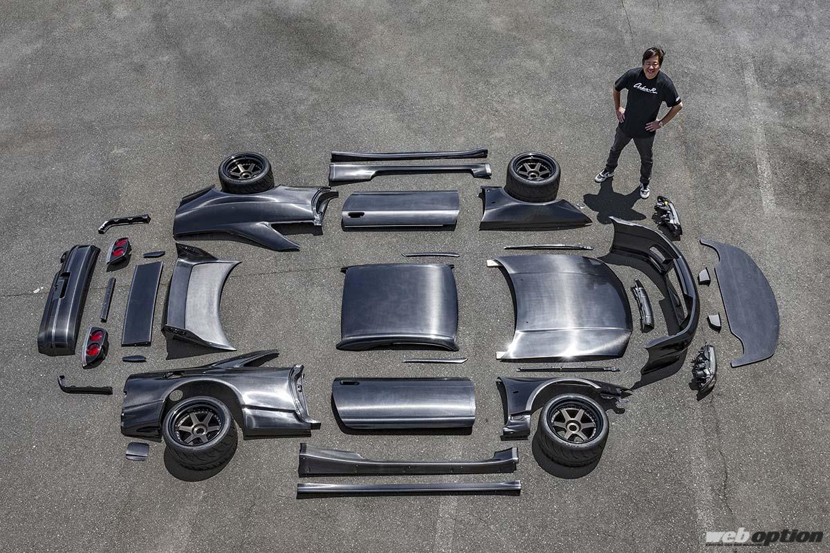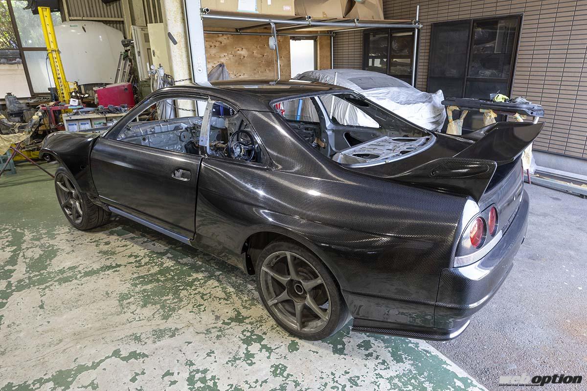 2021年から、3年連続でSEMAショーにフルドライカーボンボディのBNR32を出展してきた“ガレージアクティブ”。そんな同社が、次なる一手として製作を進めているのが、BCNR33用のドライカーボン製ワイドボディキットだ。