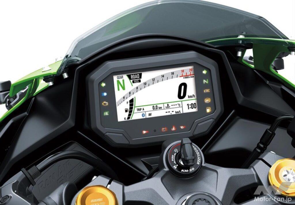 今回のモデルでは、カラーリングとグラフィックの変更が施され、新たに「メタリックマットミステリアスグレー×メタリックフラットスパークブラック」のカラーが採用された。これにより、Ninja ZX-25R SEのアグレッシブなスタイリングがさらに際立ち、都市部でも存在感を放つデザインとなっている。