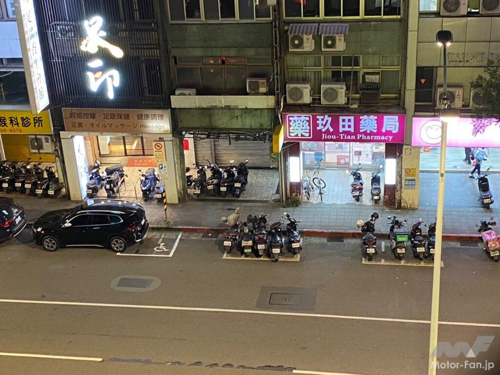 道路上にはバイク駐輪用の枠が書かれており、ここに駐輪することができるほか、写真では歩道上にも駐車しており、このような駐輪方法にも寛容なのが台湾なのだ。