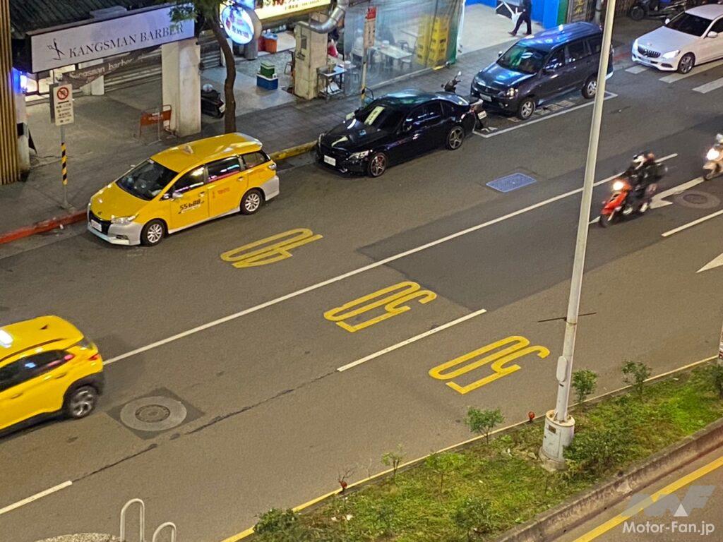 台北市内の画像。台湾は右側通行で、歩道に近い車線は速度制限が40km/hだが、それより左の車線は50km/h制限となっている。危険性が高い歩道近くはゆっくり走行させて、危険性が低いレーンは高効率な高い速度に設定されている。