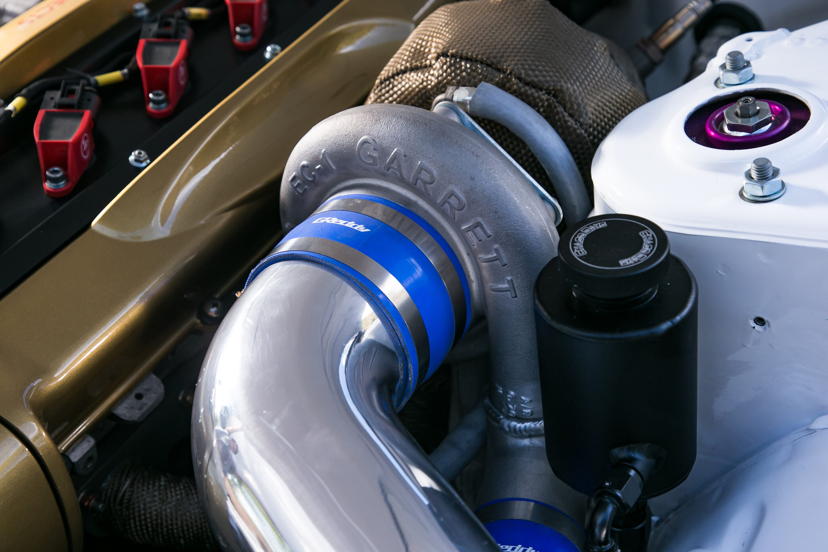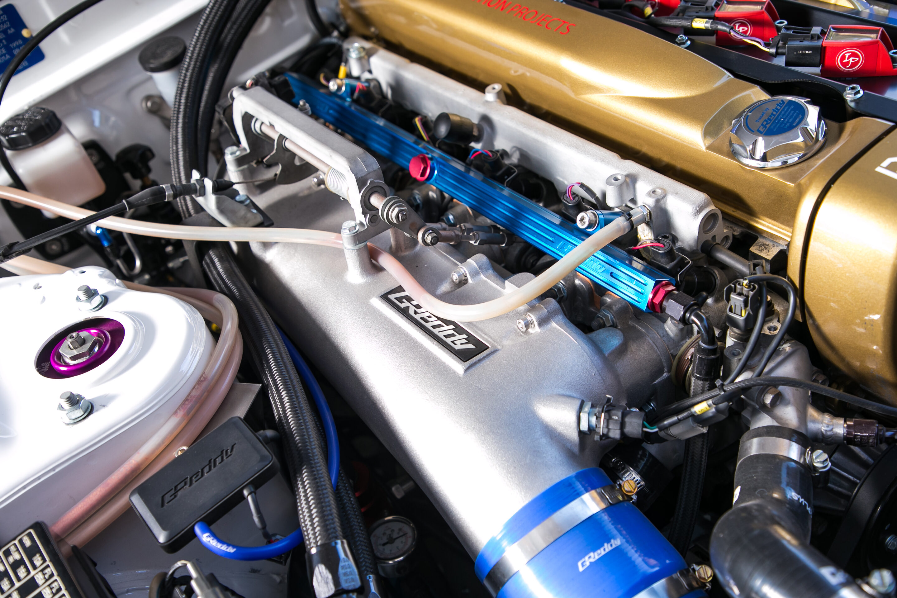 ベンがそう語る通り、パワートレインにはBNR32から移植されたRB26DETTと、HCR32用の5速MTを搭載。タービンはギャレットのGTX3582Rを使用し、インタークーラーやインマニ、タイプFVブローオフバルブなど、吸排気系や冷却系にはGReddyのハイパフォーマンスパーツを惜しみなく投入している。