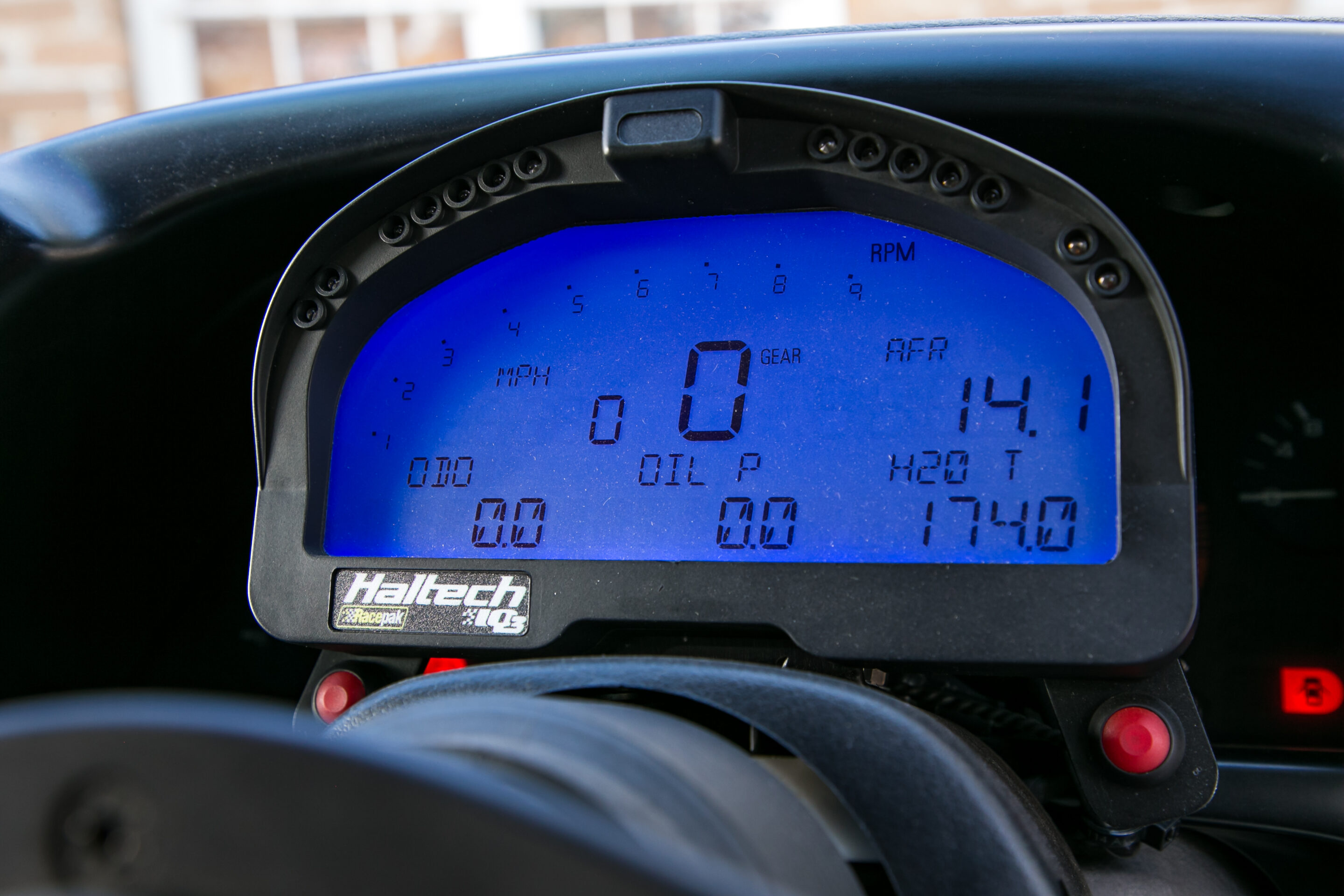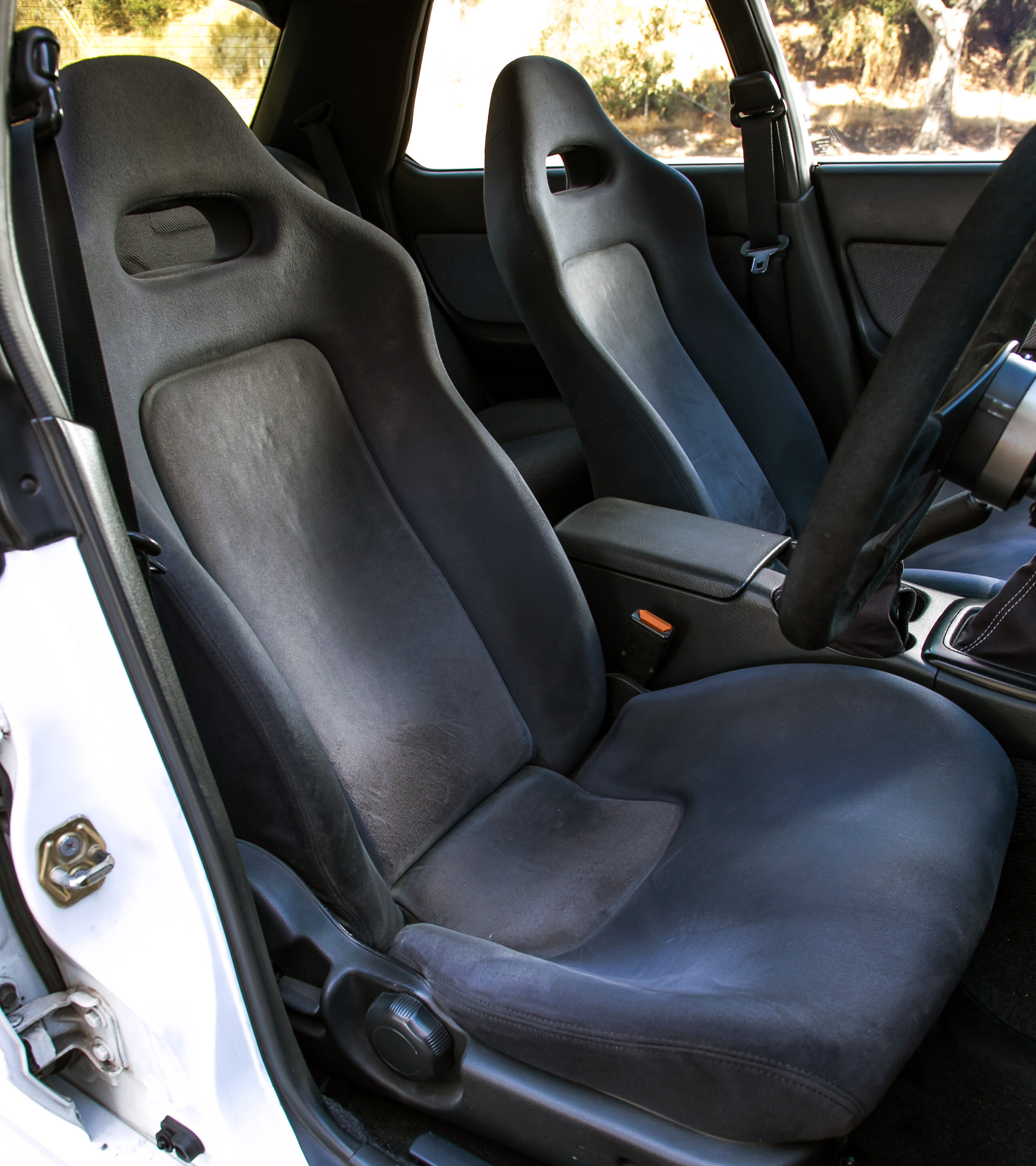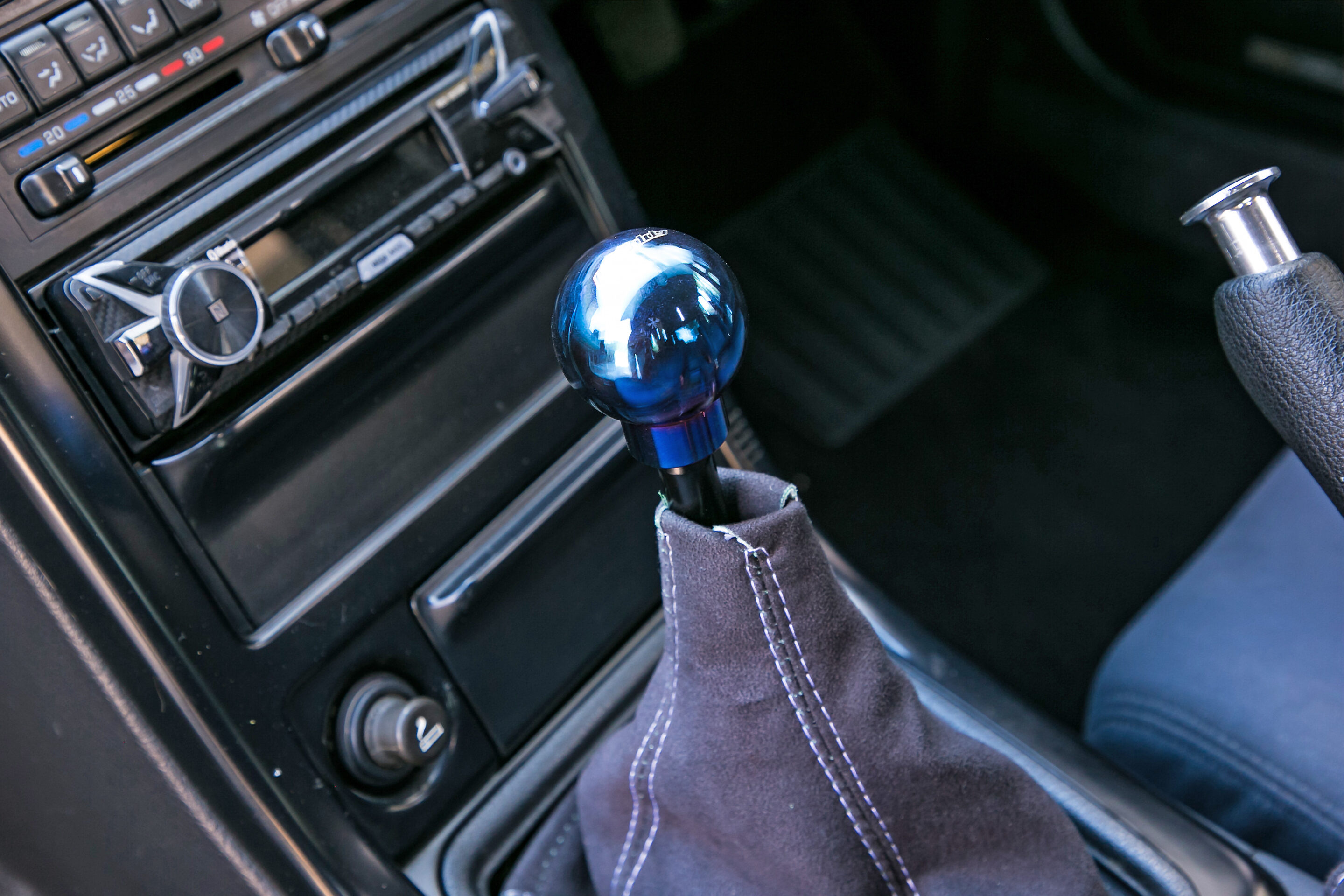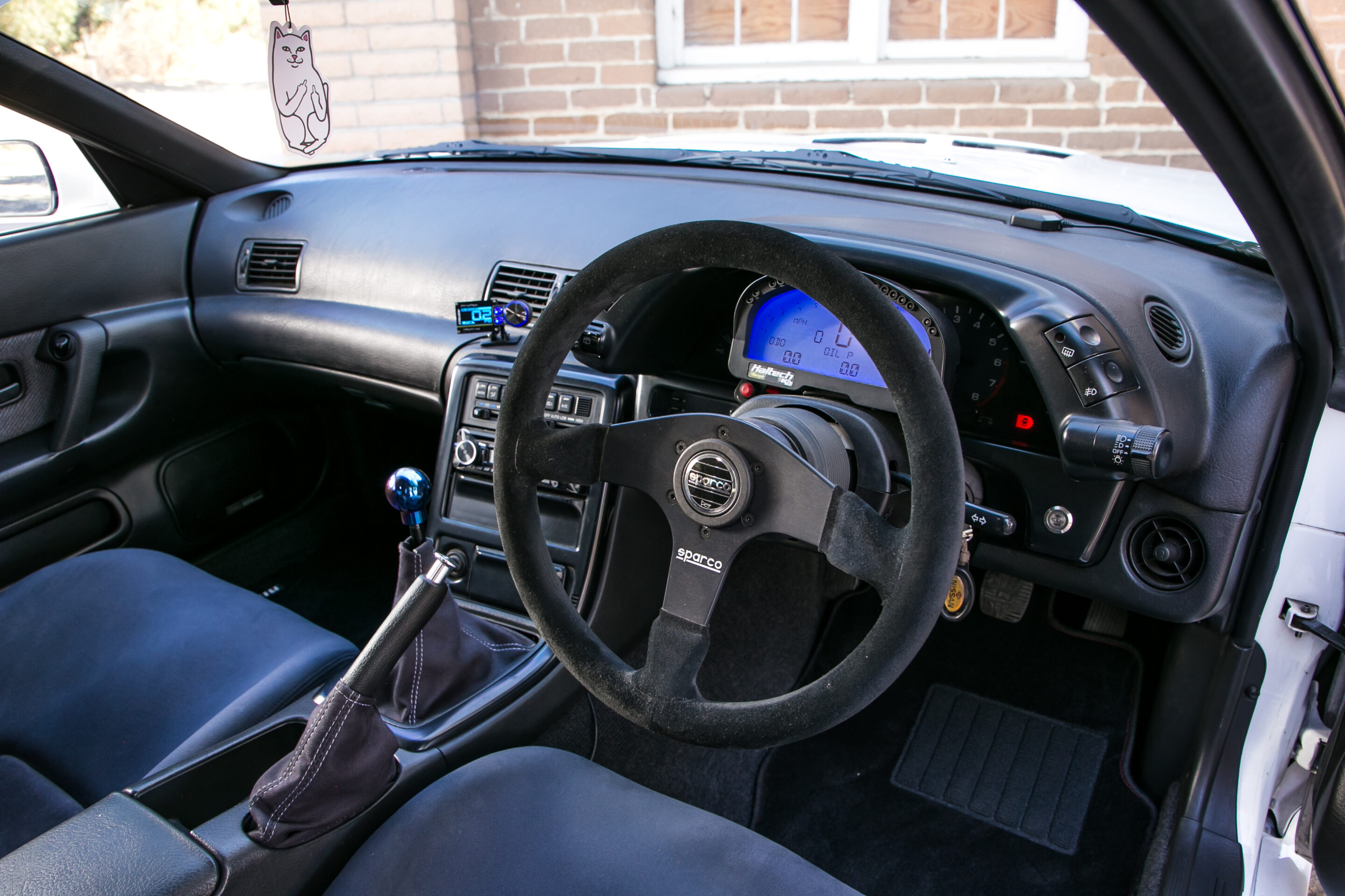 街乗り仕様というのに、まったく生活感を感じさせないインテリア。GReddyのプロフェックOLEDブーストコントローラーやシフトノブ、RacepakのIQ3ダッシュメーターなどが備わり、スポーティなムードが高められている。