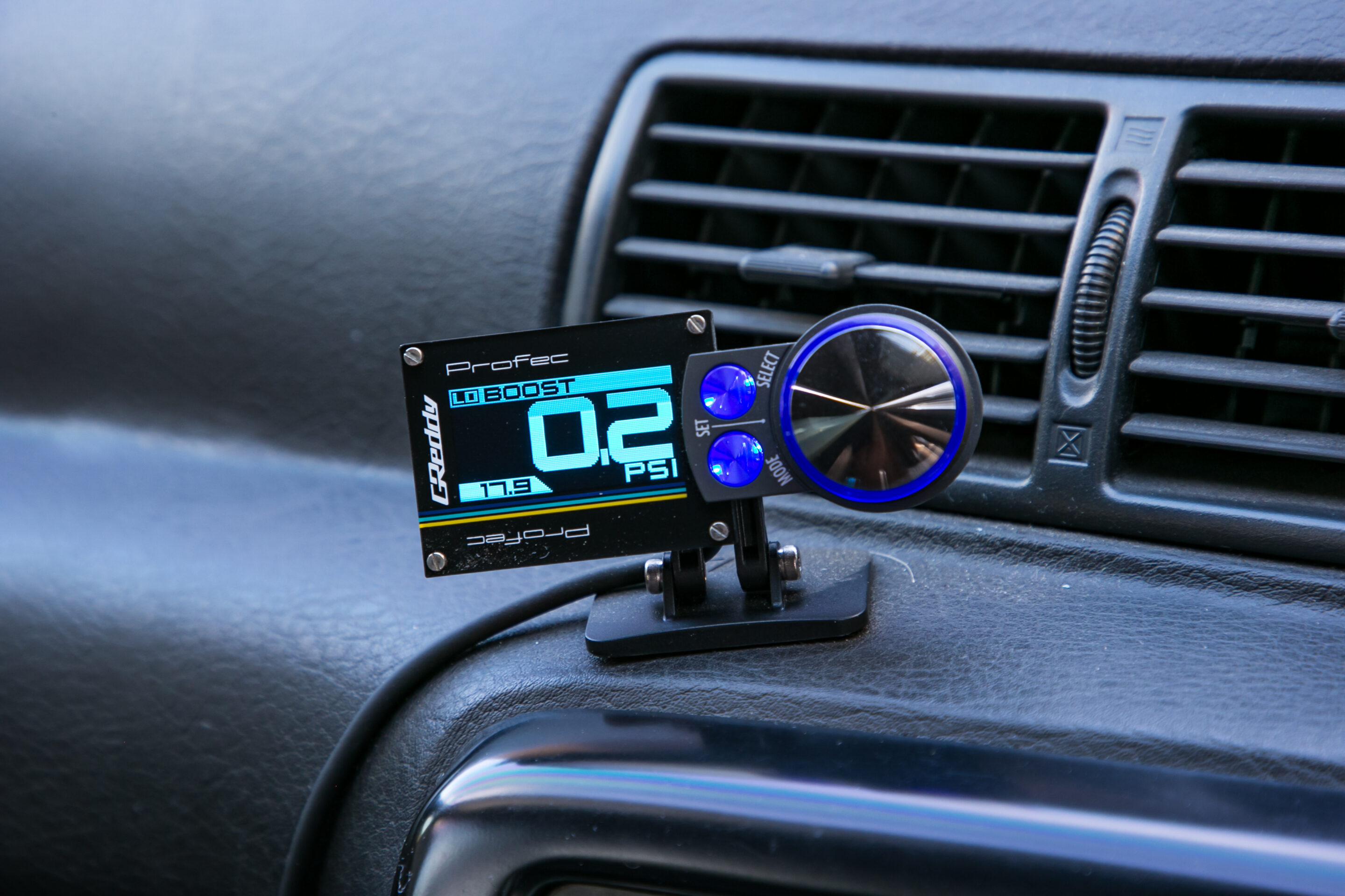 街乗り仕様というのに、まったく生活感を感じさせないインテリア。GReddyのプロフェックOLEDブーストコントローラーやシフトノブ、RacepakのIQ3ダッシュメーターなどが備わり、スポーティなムードが高められている。