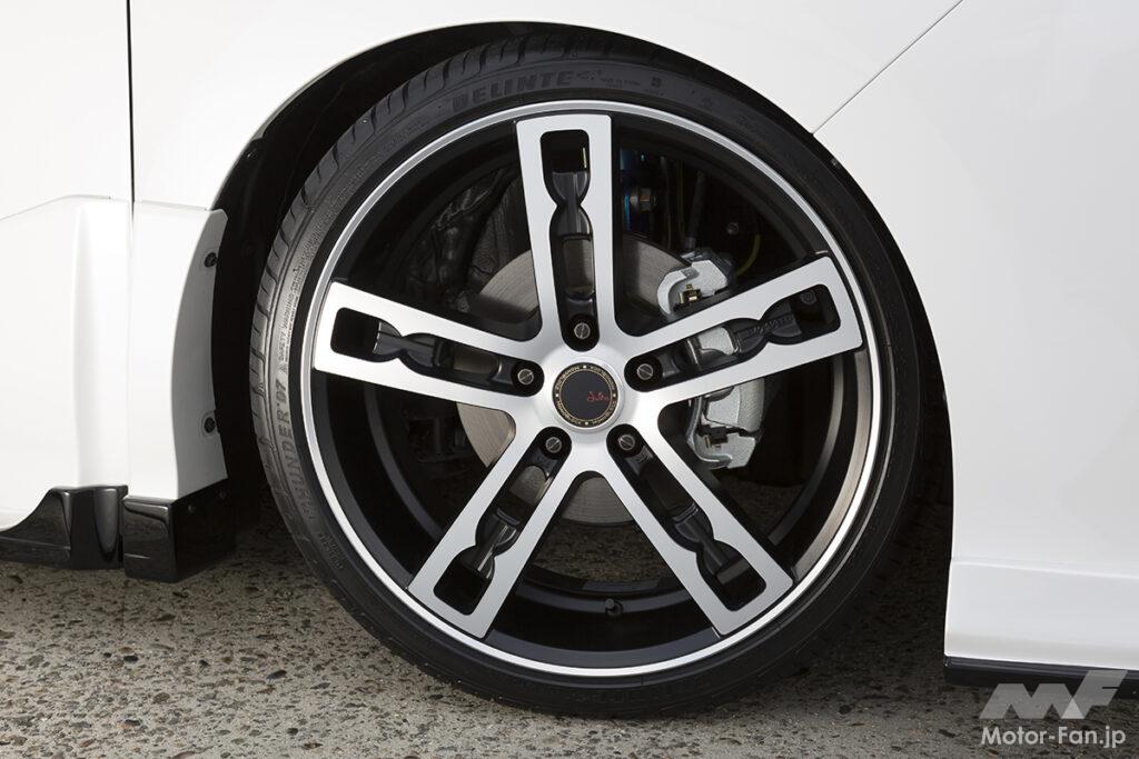 エクスクルーシブゼウスの80系ノア後期Si用エアロは、ハーフタイプのグレースラインからリリース。デモカーのエアロは3点ともに2色塗り分け塗装済みタイプを装着している。