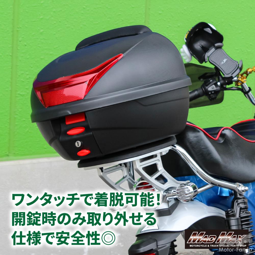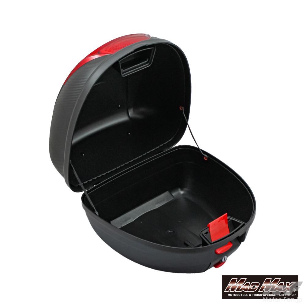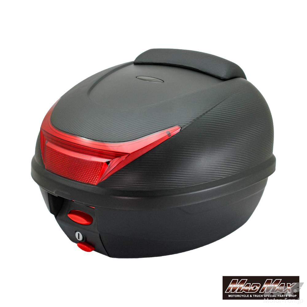 リアボックスに求めるものは人それぞれだが、通勤や通学、街乗り中心なら“まずは使いやすいこと”がいちばん大事。その意味で、このマッドマックスのリアボックスはかなりわかりやすい一台だ。商品名どおりバックレストを備えた34L仕様で、必要な装備をきっちり押さえたベーシックな構成になっている。