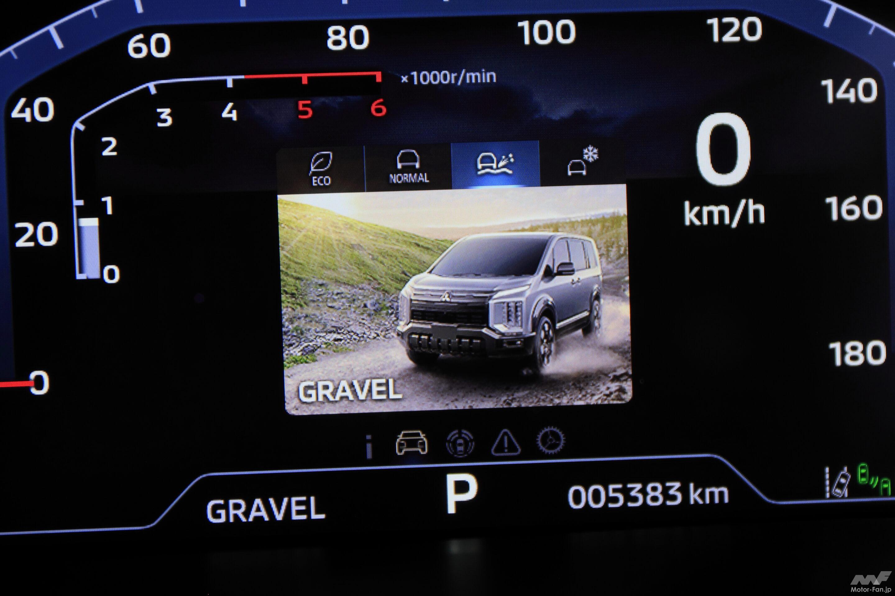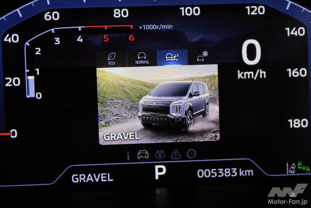 オフロード性能&スライドドアというデリカの伝統を進化させたことの証明といえるのはグラベル・モードの設定だ。グラベルとは砂利道などの未舗装路を示す言葉で、モータースポーツではラリーで使われることが多い。まさにラリーによって技術を鍛えてきた三菱自動車の矜持を感じさせるドライブモードである。