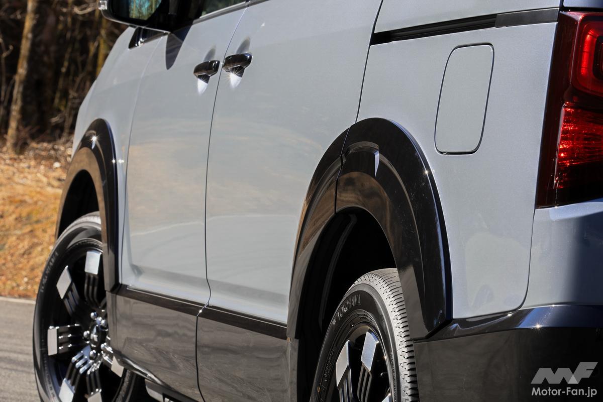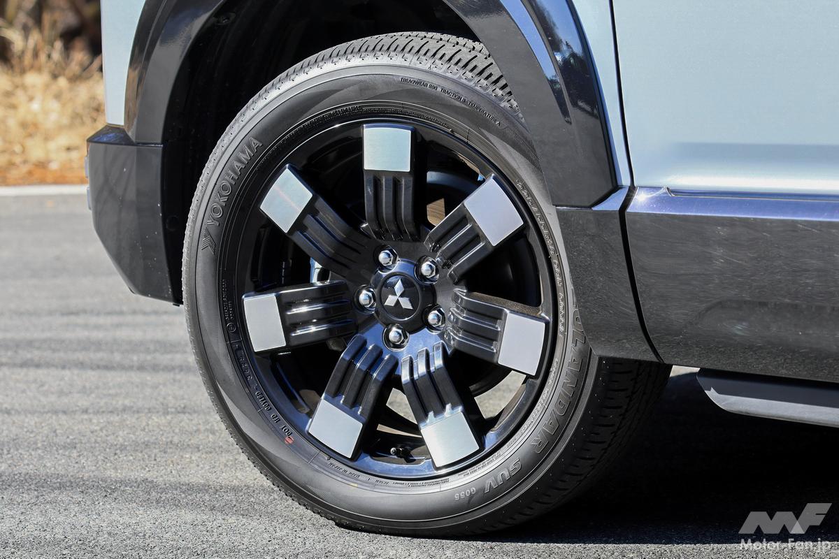 ルックスにおいても、デリカD:5は大きく進化している。最大のポイントは片側10mmのワイド化に寄与するホイールアーチモールを新設したこと。タフネスなデザインとなった18インチアルミホイールや専用設計のタイヤと合わせて、足元の力強さが増している。ボディがワイド化したといっても、全幅は1815mmに収まっており、取り回し性をスポイルしていない点も見逃せない。