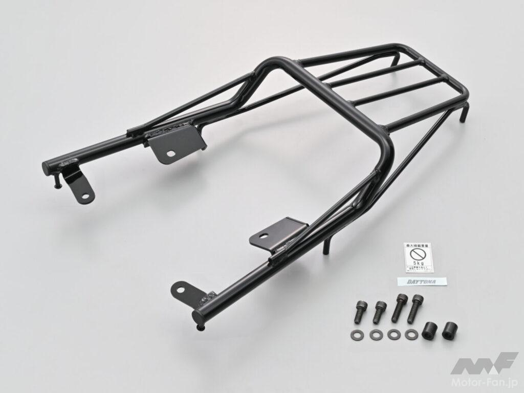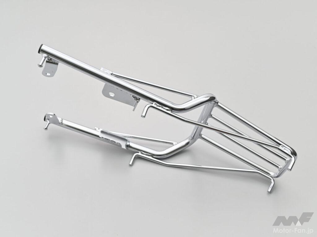 W230、メグロS1のボディラインにそってデザインされた美しいパイプワークのクラシカルな造形のリヤキャリア。キャリアの天面をタンデムシートに近づけて同じ高さにすることで、大きな荷物を積載しやすくデザインされている。最大積載量は5kgで、長年使用しても壊れない安全設計となっている。GIVIモノロックケースが取り付け可能。また、同社のサドルバッグサポートとの同時装着が可能となっている。カラーはブラックとクロームメッキの2種を用意する。