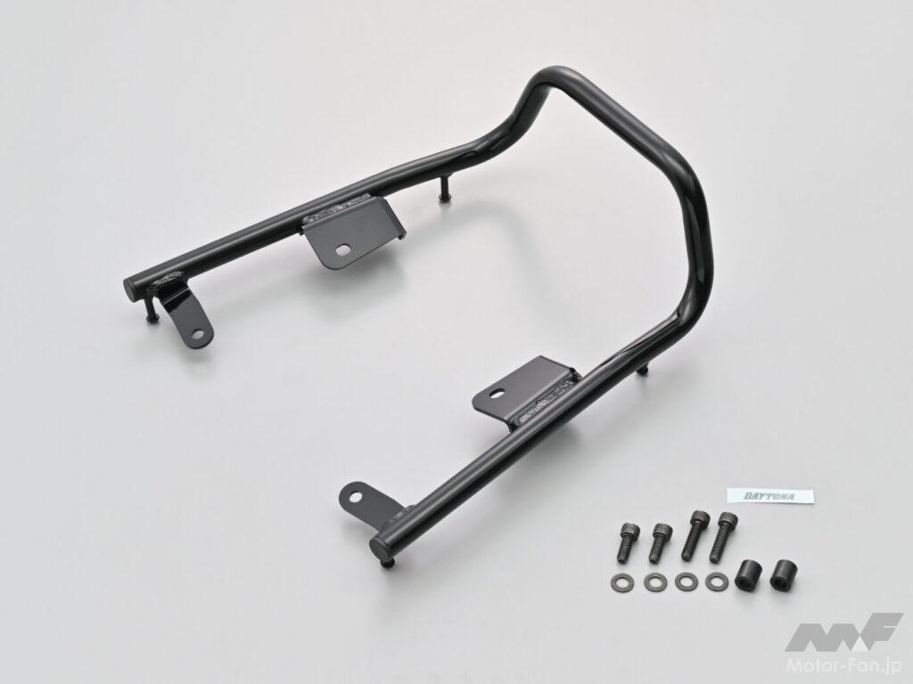 車体にサドルバッグを取り付けるためのサポートパーツ。サドルバッグのベルト掛けループを一体化した形状。ベルト掛けループにはユーティリティネットをかけることもできるので多くの荷物を積載する時にも便利。サドルバッグはデイトナ製だけでなく、ベルトの左右ピッチ190mm前後のバッグに対応しているので、お気に入りのバッグを取り付けることも可能だ。バッグサポート部は縦方向に十分な長さをとっているので、サドルバッグがリヤサスやリヤアクスルに接触しにくい設計になっている。先に紹介したクラシックキャリアやグラブバーとの同時装着が可能だ。左側用、右側用があり、同時装着が可能。