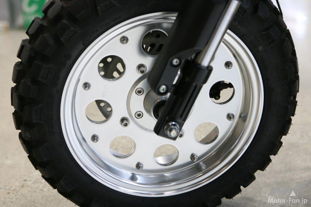 Gクラフトといえば、アルミ製ワイドホイール。ノーマルブレーキのまま装着できリム幅も太い。8ホールデザインがモンキー125にマッチ。