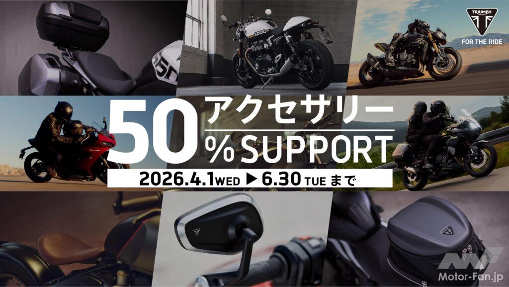 トライアンフモーターサイクルズジャパンは、2026年4月1日から6月30日までの期間、「アクセサリーご購入50%サポートキャンペーン」を全国の正規販売店で実施する。ツーリングシーズン本格化に合わせ、新車購入時のカスタマイズ需要を後押しする施策となる。 本キャンペーンは、新車の注文時に純正アクセサリーを同時購入することで、対象アクセサリーが通常価格の50%オフで装着可能となる内容。外装パーツや快適装備などを大幅なコストダウンで導入できる点が大きな魅力だ。 対象はトライアンフの新車全般だが、一部の限定モデルや特定車種は対象外。基本条件としてアクセサリー購入額が税込11万円以上必要となるが、400ccクラスの一部モデルでは金額条件なしで適用される。 購入と同時にカスタムを完成させられる本施策は、納車時から理想の仕様を実現できる点が特徴。春のツーリング需要に合わせ、ブランドの魅力をさらに高める販売促進策として展開される。