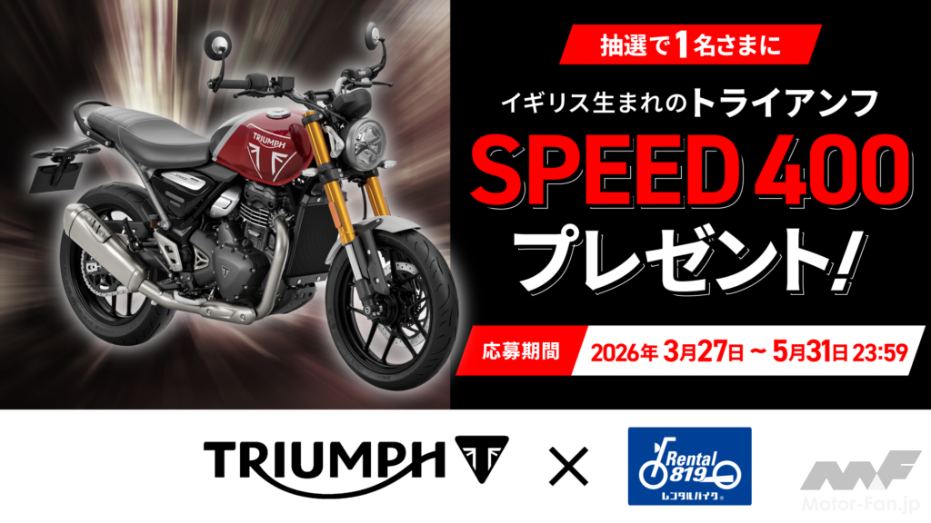 トライアンフモーターサイクルズジャパンは、レンタルバイク事業「レンタル819」を展開するキズキレンタルサービスとの協業を開始した。ブランド認知の向上と新規ライダー層の獲得、試乗機会の創出を目的とした取り組みとなる。 本協業により、レンタル819のラインアップにトライアンフ車両を順次導入。第一弾として、幅広い層に人気の「SPEED 400」を展開し、誰でも気軽にトライアンフの走りを体験できる環境を整える。 さらに協業開始にあわせ、SPEED 400(認定中古車)が当たるプレゼントキャンペーンも実施。レンタルを入口とした体験機会を広げることで、購買への導線強化とブランド接点の拡大を図る。 トライアンフは今回の取り組みを通じ、従来の販売中心の接点に加え、レンタルという新たなタッチポイントを構築。より多くのユーザーにブランドの魅力を届け、国内バイク市場の活性化にもつなげていく。