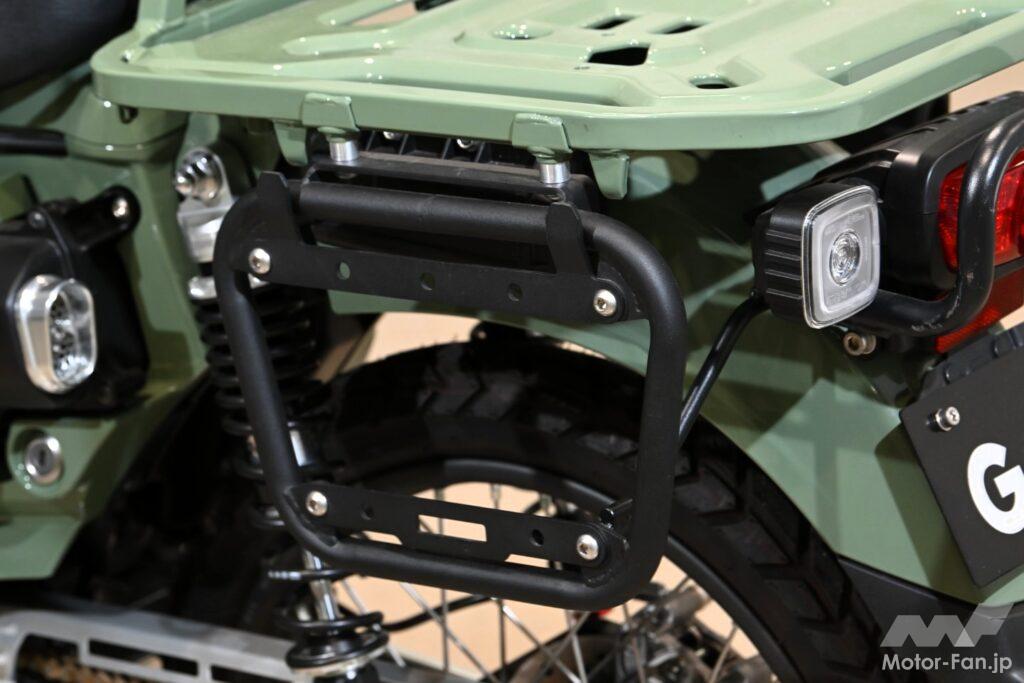 リア周りをガッチリガードする「リアバンパー(1万5400円)」。小さなキャリアに大きな夢! これに「ブレーキペダルカバー」を組み合わせ、足元の操作性を劇的に向上させている。キャンプ場や林道など、悪路に挑むクロスカブには必須の装備だ。一見地味だが、長時間の走行でその真価を発揮する、ベテランも唸るチョイスだ。