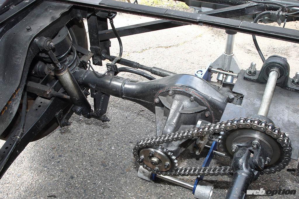 駆動系のメイキングも強烈だ。クワイフ製バックギアボックスから延びたプロペラシャフトはギア(スプロケット)に繋がり、バイクのようにチェーンを介してホーシングに駆動力を伝達する仕組み。ちなみに、ホーシングは三菱の軽トラ「ミニキャブ」のものを流用。スプロケットは工業用の汎用品、チェーンは隼用を長さ調整してセットしている。