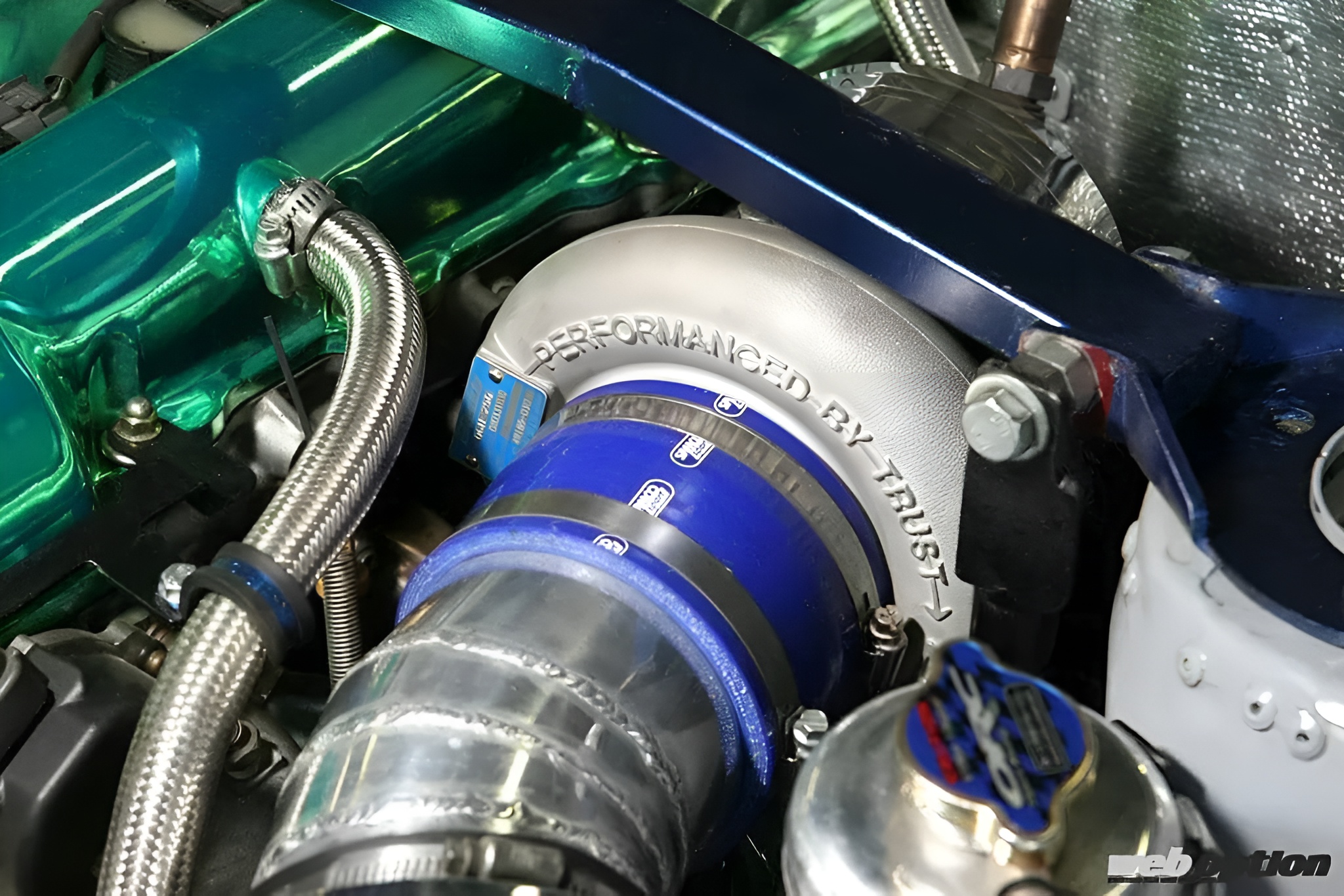 組み合わせるタービンはウエストゲート式のTD06-25Gで、MAX500psを発揮。サージタンクはトラストの大容量&ショートポートタイプを選択している。